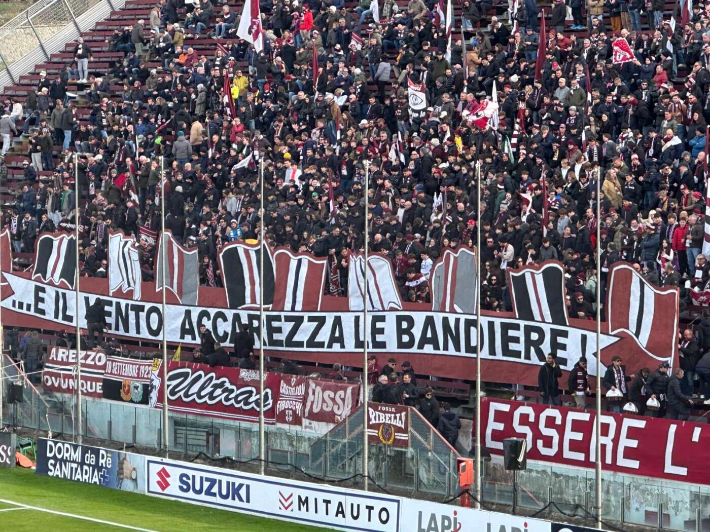 Il richiamo del Comitato Orgoglio Amaranto non è rimasto inascoltato. Dopo l’appello “Tutti allo stadio” lanciato in settimana, i tifosi hanno risposto presente: la Curva Sud Lauro Minghelli, cuore pulsante del tifo aretino, offre una coreografia mozzafiato, gremita e colorata come nelle grandi occasioni.