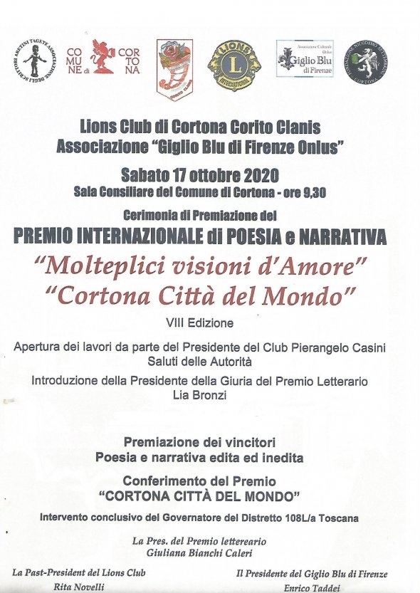 Nella sala consiliare del Comune di Cortona è in programma la cerimonia di consegna del Premio internazionale di poesia e narrativa “Molteplici visioni d’amore, Cortona città del mondo”, giunto quest’anno alla sua ottava edizione. L’appuntamento si svolgerà sabato 17 ottobre, con inizio alle ore 9:30