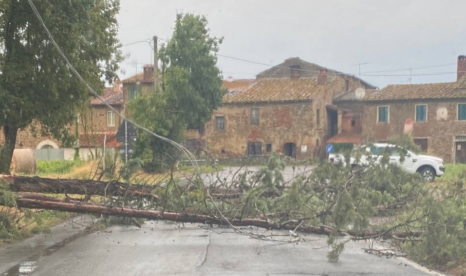 Quella di ieri è stata una giornata drammatica sul fronte maltempo in tutta la Toscana, in particolare nelle province di Massa e Lucca: un uomo e una donna hanno perso la vita, travolti dalla caduta di alberi, gli uomini dei Vigili del Fuoco sono al lavoro in tutta la Regione. Strade chiuse, 100 evacuati. Giani ha dichiarato lo stato di emergenza regionale. Anche in provincia di Arezzo si contano i danni del “downburst” collegato al passaggio del fronte temporalesco originatosi nella zona di San Vincenzo, Livorno che ha poi seguito l’andamento della costa fino alle Alpi Apuane, spostandosi poi verso l’interno fin oltre Firenze e Arezzo. Una cinquantina gli interventi nella giornata di ieri nel territorio aretino, altri trenta nel corso della notte e del mattino, a causa dei nubifragi, accompagnati da forte vento, grandine e un’ininterrotta attività elettrica con lampi, tuoni e fulmini, che hanno colpito il territorio dalle 23 di ieri sera. Il punto della situazione in Valdarno e Valtiberina, le due vallate più colpite dall’ondata di maltempo. (Nella foto principale: un albero caduto lungo la strada tra Agazzi e Bagnaia, Arezzo).