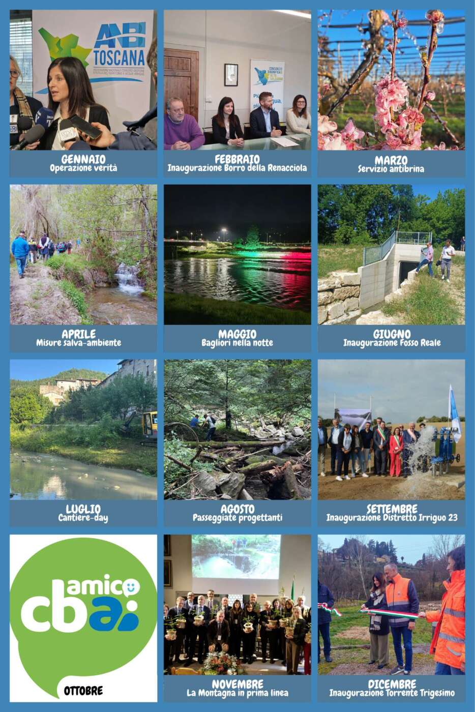 Le principali tappe dell’anno sono state riassunte in un calendario sintetico che richiama solo i momenti più significativi di un’attività in realtà ben più ampia, strutturata, continua e capillare, sviluppata quotidianamente sull’intero comprensorio di competenza che abbraccia 4.000 kmq di superficie, articolati in 54 comuni e 3 province.