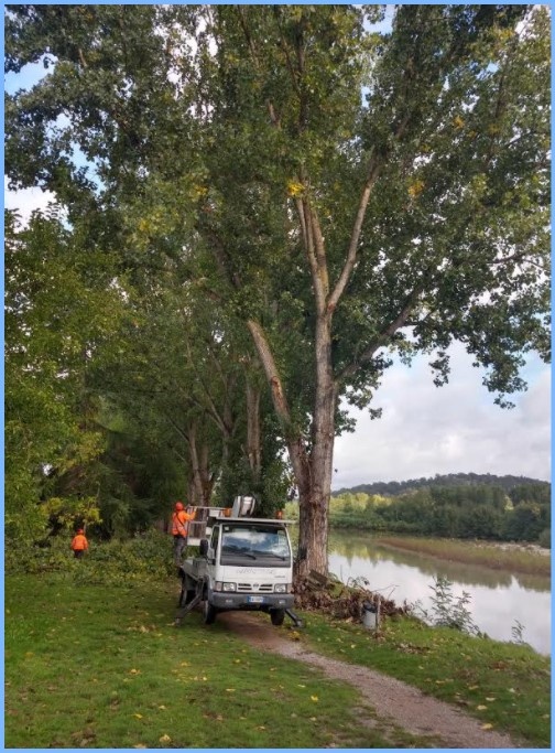 “Abbiamo chiesto il parere di un dottore forestale che, dopo aver analizzato lo stato delle alberature, ha giudicato necessario l’intervento di taglio”, precisa Lanusini. “L’operazione è stata eseguita da operai specializzati che hanno lavorato in quota, con l’ausilio di una piattaforma aerea. Diminuito il carico, l’apparato radicale delle piante è stato conservato in vita perché potesse continuare a svolgere la funzione di “ancoraggio” della sponda in erosione”.