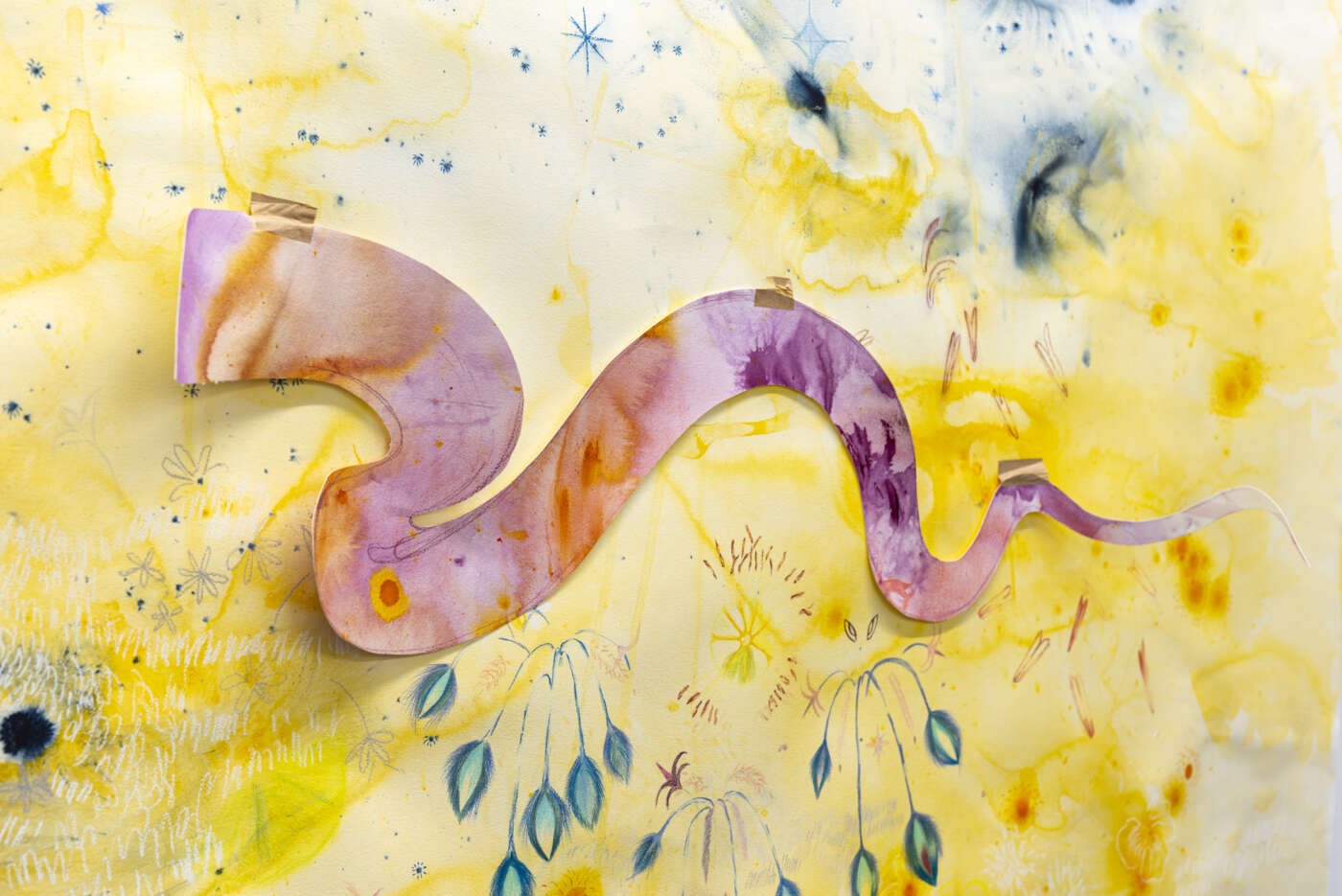 Il percorso espositivo accompagna il visitatore attraverso un articolato complesso di opere realizzate con tecniche e materiali differenti, dalla pittura su cotone alla scultura in vetro, dalla stampa alla ceramica. Questa varietà di linguaggi contribuisce a costruire un allestimento capace di mettere in luce i temi centrali della ricerca di Waruguru. I materiali e le tecniche impiegate rimandano infatti al saper fare dell’universo femminile, evocando pratiche come il cucito, il ricamo e l’assemblaggio di perline, e si collegano alla dimensione privata e intima delle relazioni familiari e sociali. Allo stesso tempo, il lavoro dell’artista allude alle profonde disuguaglianze che attraversano le dinamiche del lavoro e dello sfruttamento economico nel contesto della globalizzazione e del neocolonialismo.