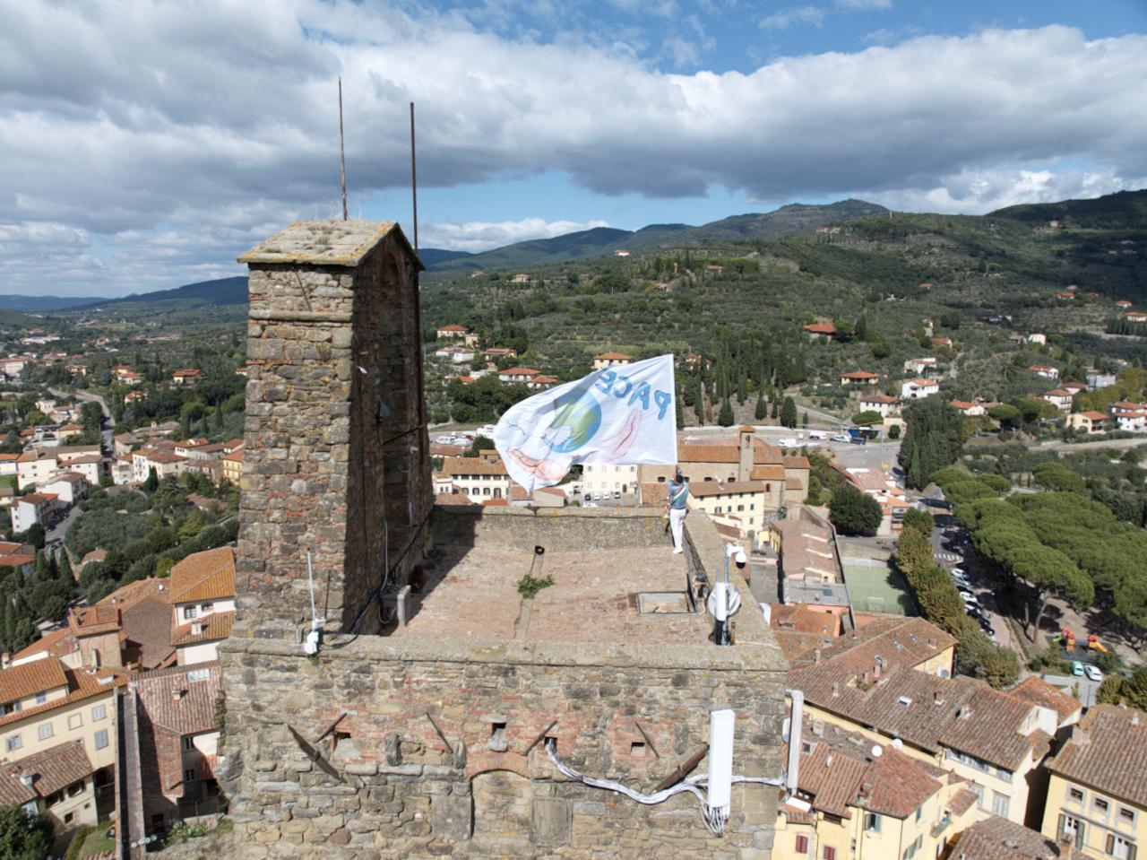 Prima il piazzale del Cassero si è trasformato in una “tela bianca” su cui gli studenti hanno realizzato il simbolo della pace, poi gli amministratori sono saliti sulla Torre del Cassero dove hanno posizionato la bandiera rappresentante una colomba e un ramoscello di olivo.