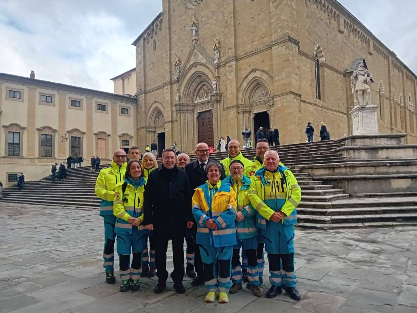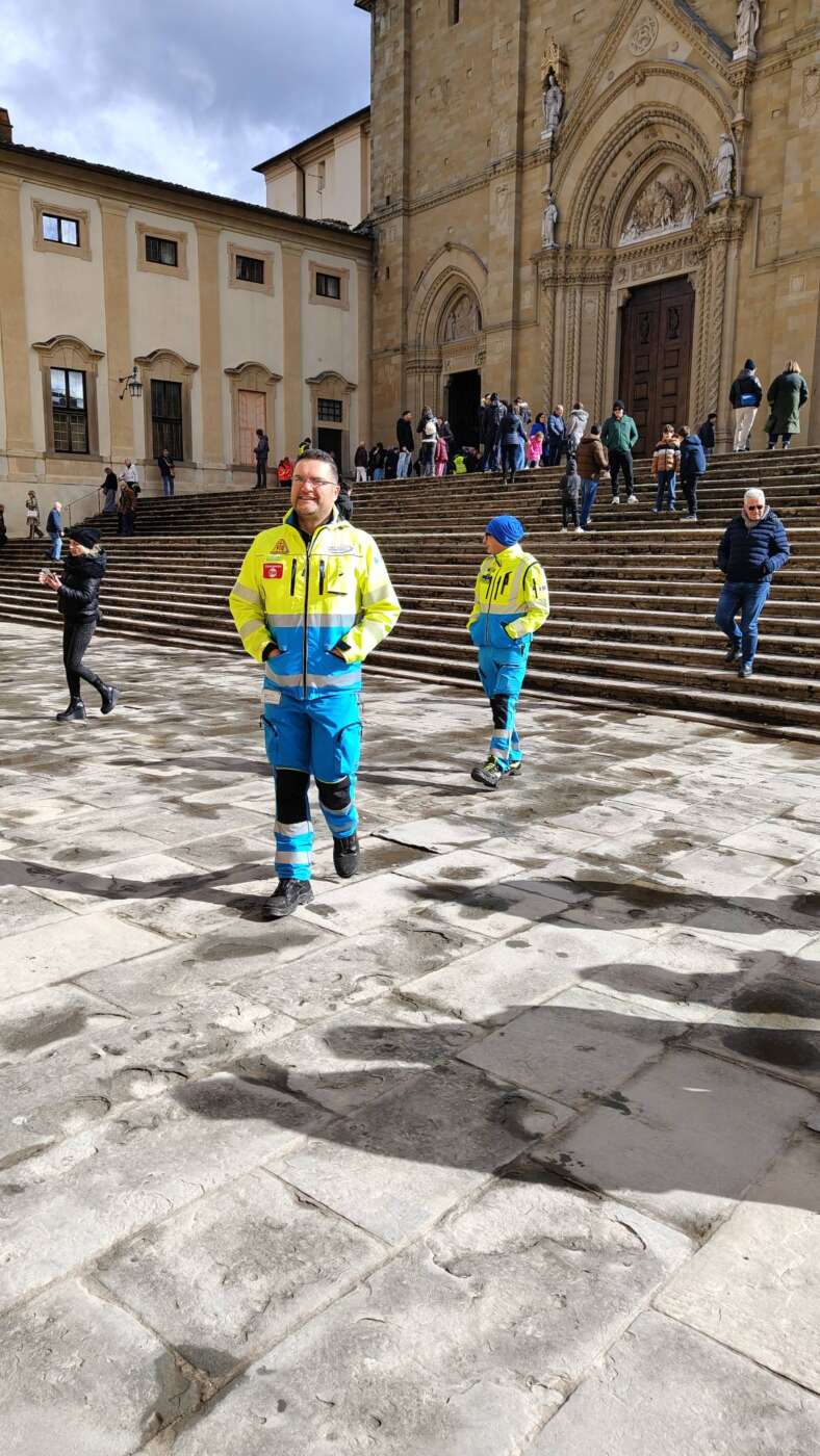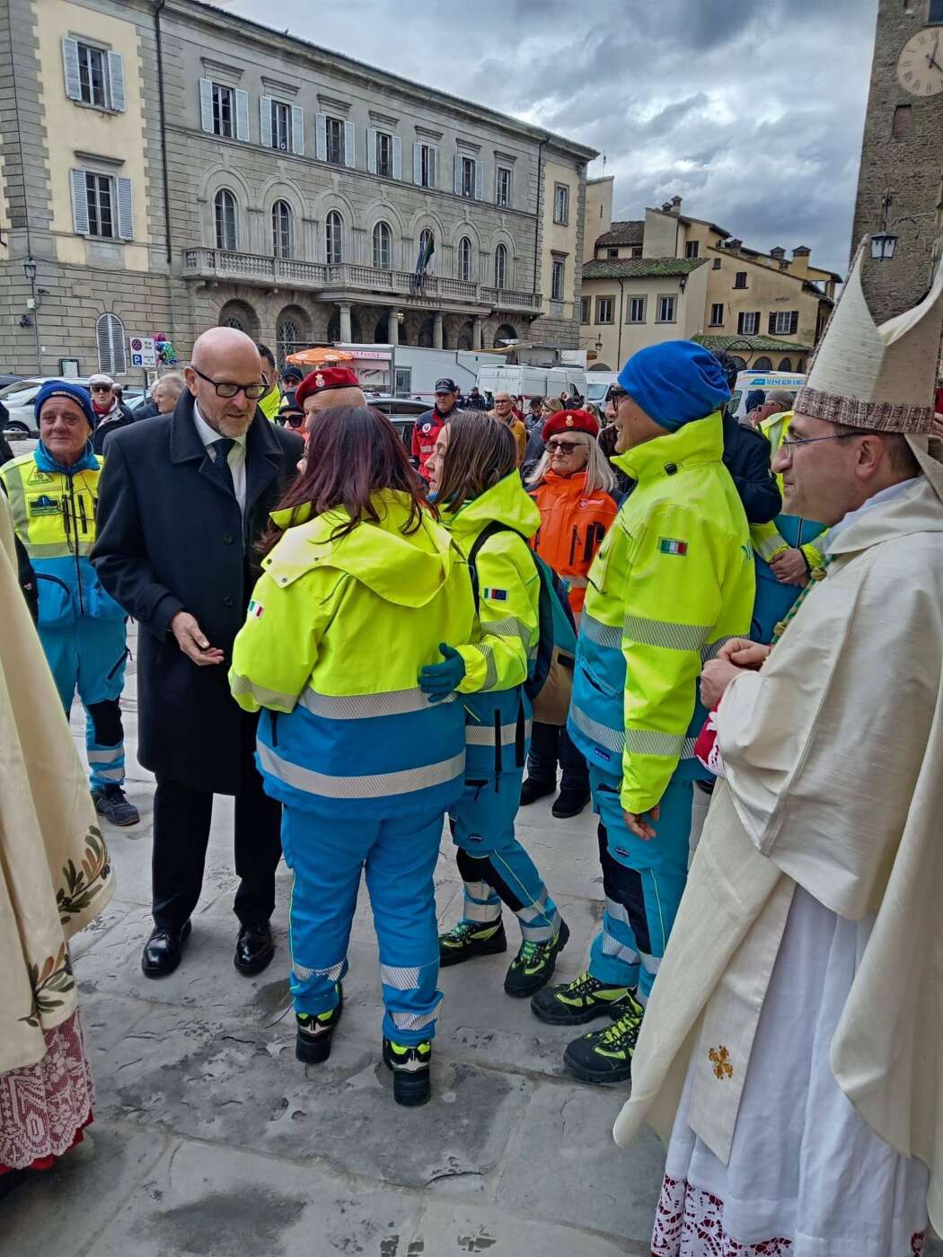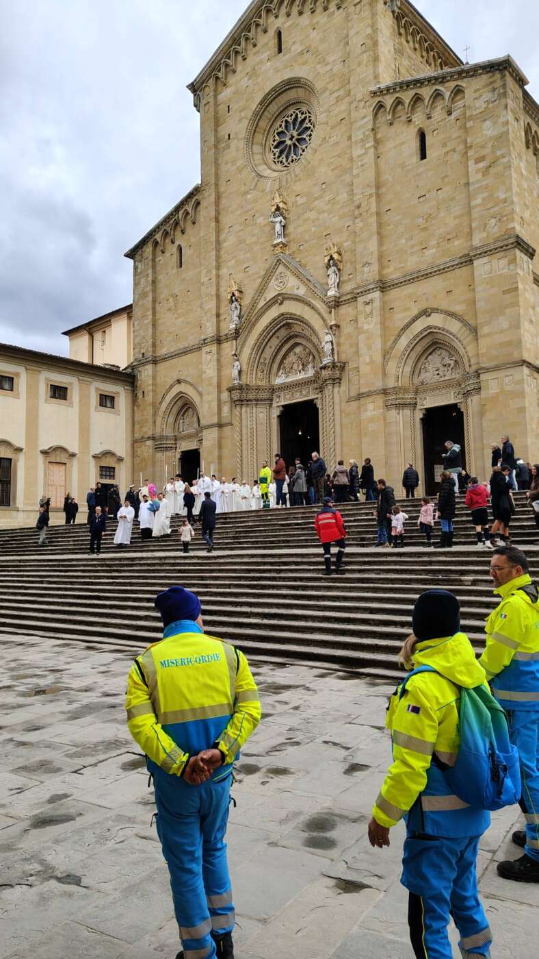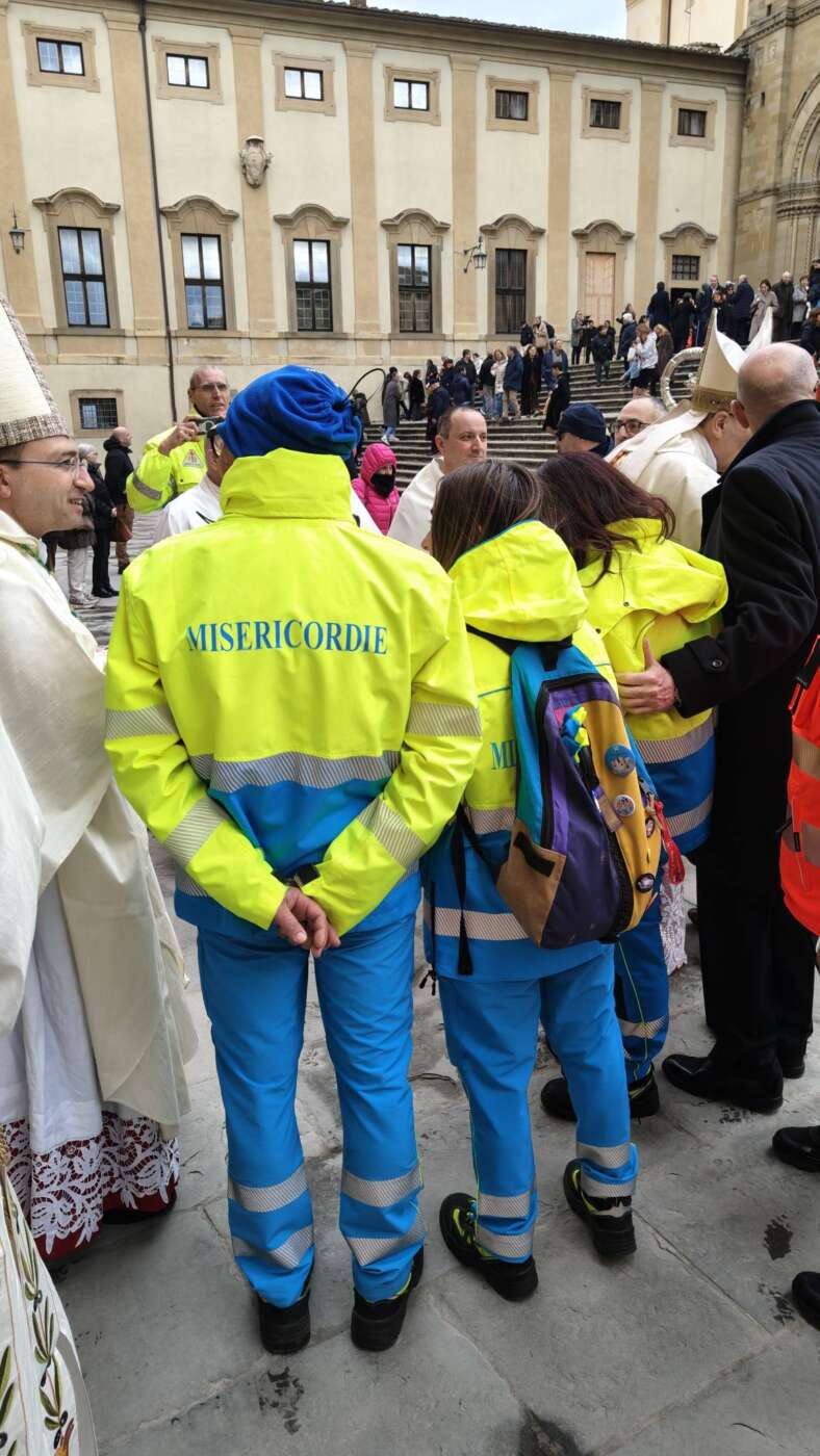 E, come si coglie tra le molte foto che seguono, a portare man forte agli equipaggi della Misericordia di Arezzo impegnati sia nell’assistenza di sicurezza sanitaria sul sagrato del Duomo, sia all’interno della cattedrale (in questo caso anche con volontari addetti alla rappresentanza della Confraternita) sono intervenuti il Presidente di Confederazione nazionale delle Misericordie d’Italia Domenico Giani; il correttore spirituale delle Misericordie d’Italia S.E. Vescovo Mons. Franco Agostinelli; lo stesso Governatore della Misericordia di Arezzo, prof. Pier Luigi Rossi, si è incontrato con il Cardinale Pizzaballa in città già da ieri. Tra i partecipanti, oltre al concelebrante la principale funzione religiosa in Duomo il Vescovo della Diocesi di Arezzo-Cortona-Sansepolcro Mons. Andrea Migliavacca, si è registrata la visita del Governatore della Regione Toscana Eugenio Giani, naturalmente del Sindaco di Arezzo Alessandro Ghinelli e altrettanto naturalmente di Don Alvaro Bardelli.