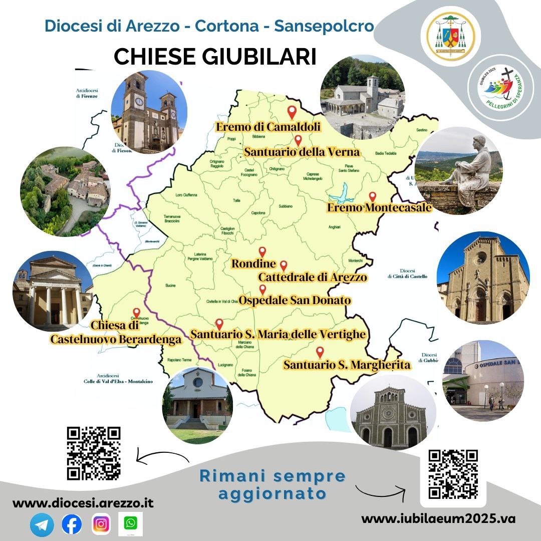 Altro momento vissuto a livello diocesano è il Giubileo degli adolescenti il 25-27 aprile; poi il Giubileo delle famiglie dal 30 maggio al 1° giugno e infine il Giubileo dei giovani dal 27 luglio al 3 agosto. Questo non toglie che a livello personale o di gruppo non si possa vivere il Giubileo attraverso gli appuntamenti proposti per le singole categorie. Il Papa apre il Giubileo con la Porta Santa nella notte di Natale, in diocesi verrà fatto sabato 28 dicembre alle 16.30 nella basilica di San Domenico in Arezzo e, dopo una processione, alle 17 inizierà l’Eucarestia in Cattedrale (in diretta su Tsd nel canale 85 e in streaming all’indirizzo www.tsdtv.it/live). Il giorno seguente ci saranno liturgie specifiche presiedute dai rispettivi parroci nella Concattedrale di Cortona (Ore 11) e nella Concattedrale di Sansepolcro (ore 18). Non sono previste Porte Sante nelle diocesi, ma ci saranno chiese giubilari, intese come luogo di incontro con la Misericordia di Dio e ottenere l’indulgenza. Nella diocesi di Arezzo-Cortona-Sansepolcro si è cercato di valorizzare alcuni tra i principali santuari del territorio e le varie zone della diocesi. Le chiese sono: Camaldoli, La Verna, eremo di Montecasale insieme alla Concattedrale di Sansepolcro, Castelnuovo Berardenga, Vertighe, santuario di Santa Margherita a Cortona e Cattedrale. A questi si aggiungono due luoghi segno, il primo è la chiesa di Rondine per richiamare l’impegno per la pace, specie nei giovani, il secondo è la chiesa dell’ospedale San Donato, luogo di presenza per chi ha bisogno della grazia e Misericordia di Dio, per i familiari dei degenti e gli operatori sanitari. Infine viene dato rilievo al carcere di Arezzo inteso come luogo di Misericordia di Dio. Sebbene non si tratti propriamente di una chiesa giubilare ospiterà una lectio divina del vescovo (19 marzo 2025, in diretta su Tsd) e forse un incontro in occasione del Corpus Domini.