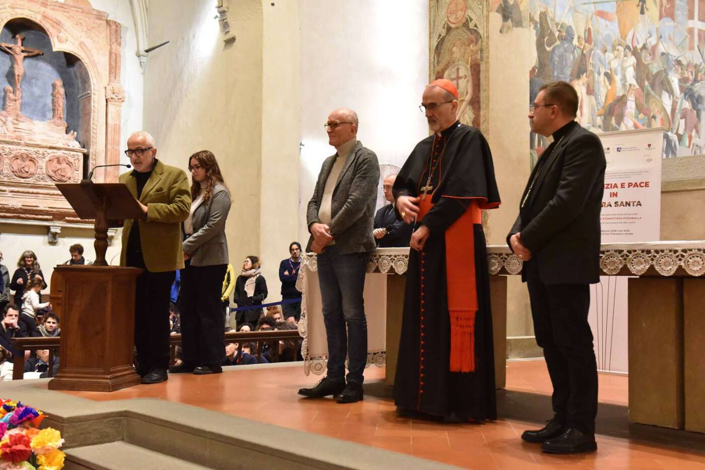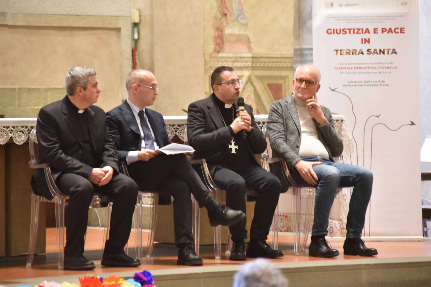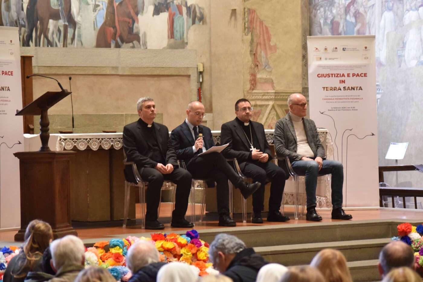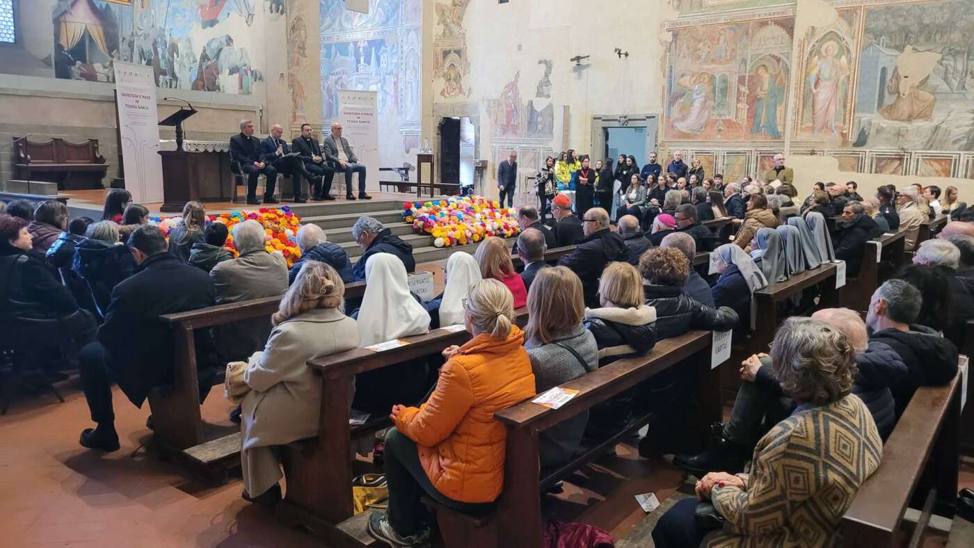 L’evento “Giustizia e pace in Terra Santa”, promosso da diocesi di Arezzo-Cortona-Sansepolcro, Rondine Cittadella della Pace e Caritas diocesana è stato accolto con grande entusiasmo e partecipazione dalla città di Arezzo. Un pomeriggio di vero dialogo dedicato a una terra martoriata e colpita da una spirale di violenza che a volte pare difficile spezzare, svoltosi in una basilica di San Francesco gremita, quasi mille i partecipanti, alla vigilia della festa della Madonna del Conforto, davanti al ciclo di affreschi della Leggenda della Vera Croce di Piero della Francesca. Un incontro di grande rilievo ecclesiale, culturale e civile, pensato per offrire strumenti di comprensione sull’attuale situazione in Terra Santa, sulla condizione delle comunità cristiane e sulle possibili vie per una pace autentica, fondata sulla giustizia, sul dialogo e sulla ricostruzione delle relazioni di fiducia.