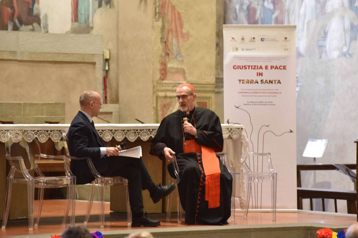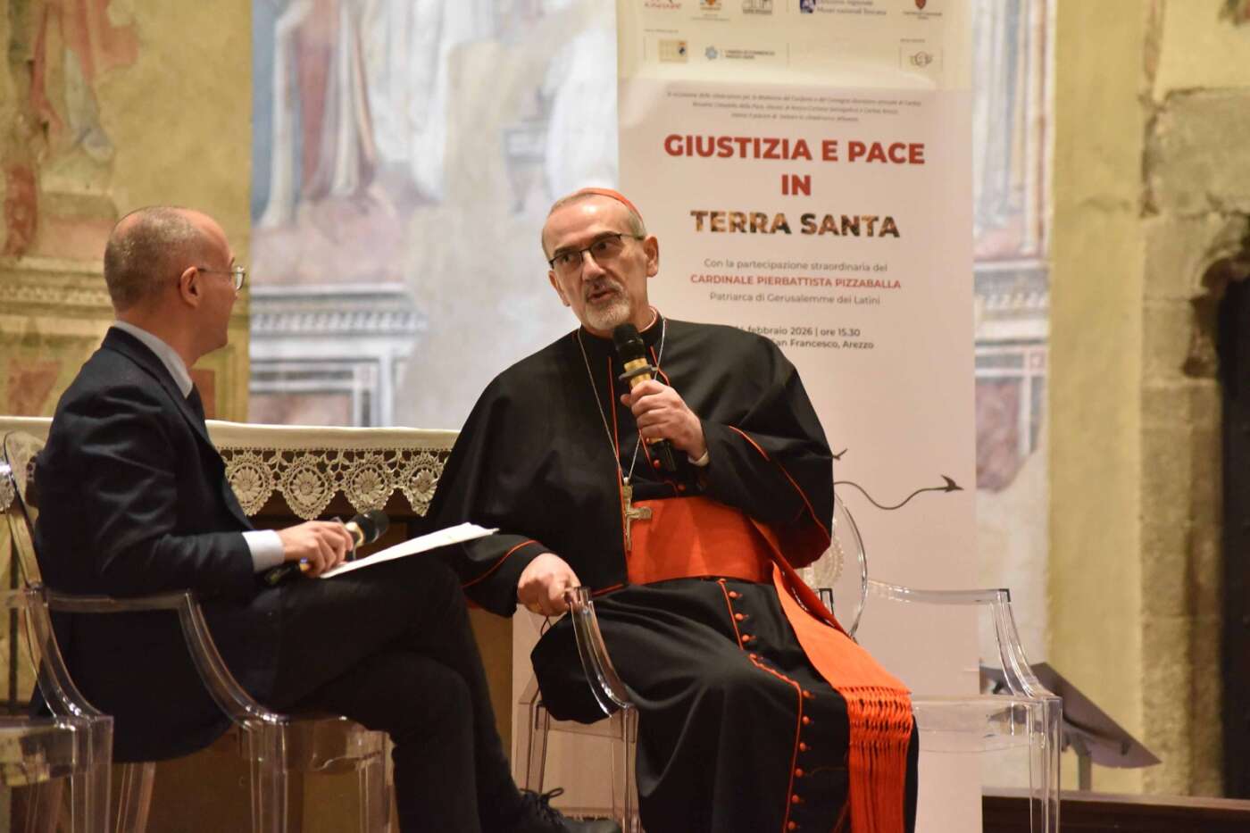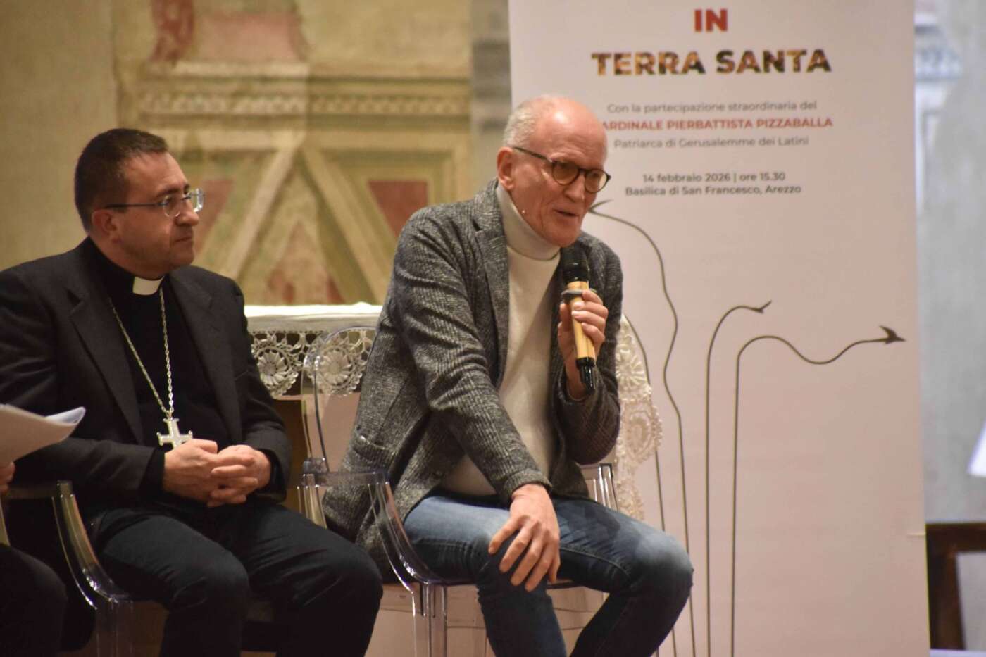 L’evento “Giustizia e pace in Terra Santa”, promosso da diocesi di Arezzo-Cortona-Sansepolcro, Rondine Cittadella della Pace e Caritas diocesana è stato accolto con grande entusiasmo e partecipazione dalla città di Arezzo. Un pomeriggio di vero dialogo dedicato a una terra martoriata e colpita da una spirale di violenza che a volte pare difficile spezzare, svoltosi in una basilica di San Francesco gremita, quasi mille i partecipanti, alla vigilia della festa della Madonna del Conforto, davanti al ciclo di affreschi della Leggenda della Vera Croce di Piero della Francesca. Un incontro di grande rilievo ecclesiale, culturale e civile, pensato per offrire strumenti di comprensione sull’attuale situazione in Terra Santa, sulla condizione delle comunità cristiane e sulle possibili vie per una pace autentica, fondata sulla giustizia, sul dialogo e sulla ricostruzione delle relazioni di fiducia.