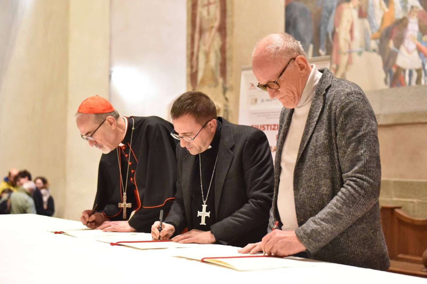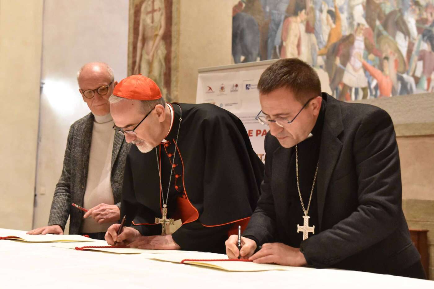 Il momento più solenne dell’incontro è stato verso le conclusioni con la firma dell’Atto di conferma del Gemellaggio fra la diocesi di Arezzo-Cortona-Sansepolcro e il Patriarcato latino di Gerusalemme a cui si è aggiunta Rondine Cittadella della Pace. Un gemellaggio siglato il 25 settembre 2010 dall’arcivescovo Riccardo Fontana, che l’aveva voluto, e dall’allora patriarca Fouad Twal. L’intesa si proponeva di “condividere con i cristiani di Terra Santa le loro preoccupazioni e il desiderio di ottenere giustizia e di vivere in pace senza essere costretti ad abbandonare quella eletta regione”. Quell’accordo è stato rinnovato, stabilendo in particolare di “stringere un legame di fraternità e di gemellaggio con la parrocchia cristiana dell’Annunciazione di Beit Jala”.