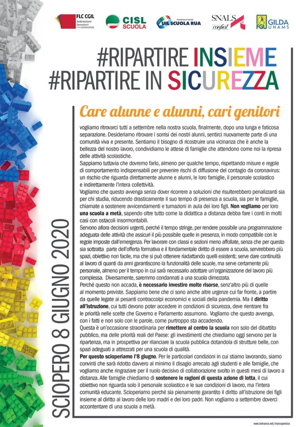 Lunedì 8 giugno lavoratrici e lavoratori sosterranno con forza queste ragioni con uno sciopero che comporta l’astensione da tutte le attività individuali e collettive: sciopereranno per chiedere che sia possibile un ritorno a settembre alle attività in presenza, che si diano per questo alla scuola risorse e personale stabile, ricordando che saranno docenti, amministrativi, dirigenti, tecnici e collaboratori i soggetti su cui ricadrà direttamente l’onere di far ripartire la scuola e di farla funzionare al meglio.