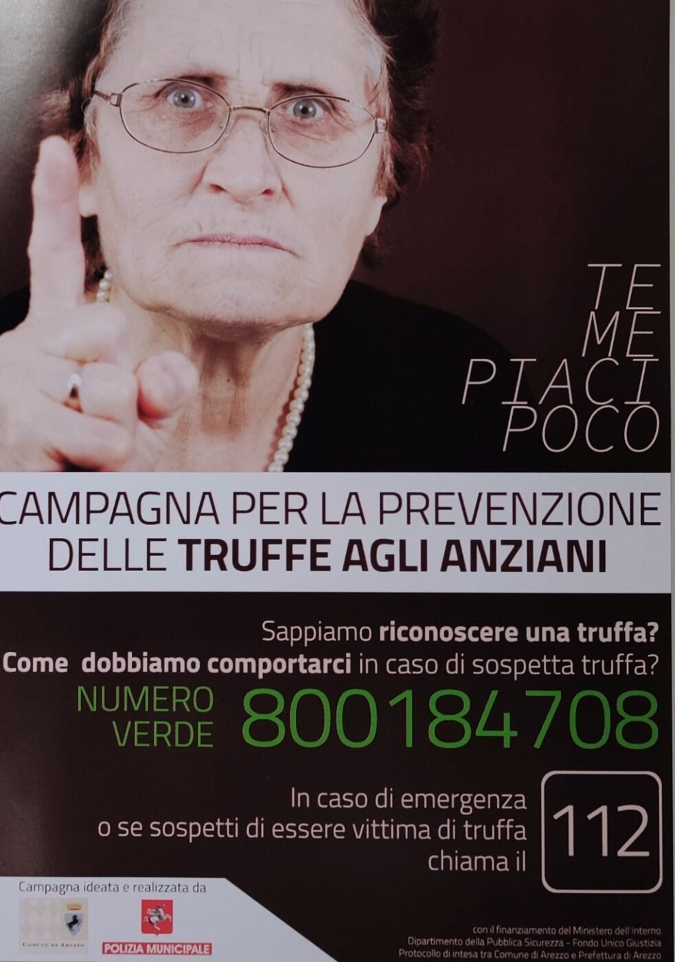 “Te me piaci poco”. L’immagine di una “nonna” tutta aretina, dallo sguardo acuto e vivace e con il dito indice alzato a mo’ di avvertimento, circola da qualche giorno in città insieme agli autobus e campeggia nei vari spazi urbani dedicati alle affissioni. È la parte sicuramente più originale, e senz’altro attrattiva, della campagna per la prevenzione e il contrasto delle truffe agli anziani posta in essere dal Comune di Arezzo. Una realizzazione che fa seguito al protocollo d’intesa tra Comune e Prefettura, sottoscritto a novembre 2020, con alla base un progetto riconosciuto valido e coerente rispetto ai criteri stabiliti dal Dipartimento delle Pubblica Sicurezza del Ministero dell’Interno ai fini dell’assegnazione dei contributi a esso destinati e riservati a 50 Comuni capoluogo di provincia con popolazione anziana più numerosa. Obiettivo del ministero, quello di coinvolgere le autorità e le amministrazioni locali nelle azioni di informazione e tutela sul territorio a completamento di quanto messo in campo dalle Forze dell’ordine a livello nazionale per combattere il fenomeno criminoso delle truffe a danno degli anziani, in particolare quelli che vivono in condizioni di solitudine e isolamento.