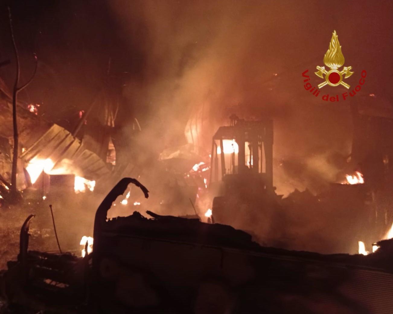 Le fiamme hanno coinvolto alcune strutture rurali adibite a deposito, all’interno delle quali si trovavano macchine agricole e attrezzature da lavoro. Al momento dell’arrivo dei soccorsi, l’incendio risultava già esteso all’intera struttura.