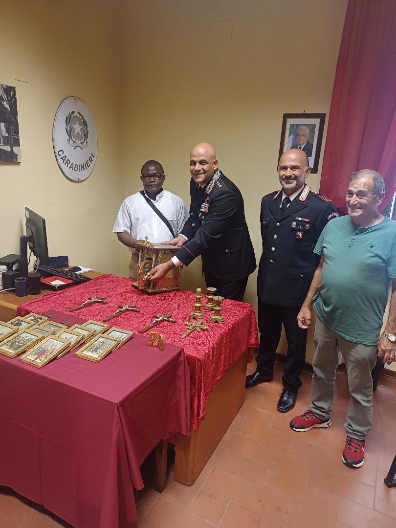 Questa mattina, presso la sala rapporto della Compagnia dei Carabinieri di Cortona, si è svolta la cerimonia di restituzione di vari oggetti religiosi a Don Teodoro Yani, vicario responsabile della parrocchia di Camucia-Farneta e rappresentante della diocesi di Arezzo. Gli oggetti restituiti includono: