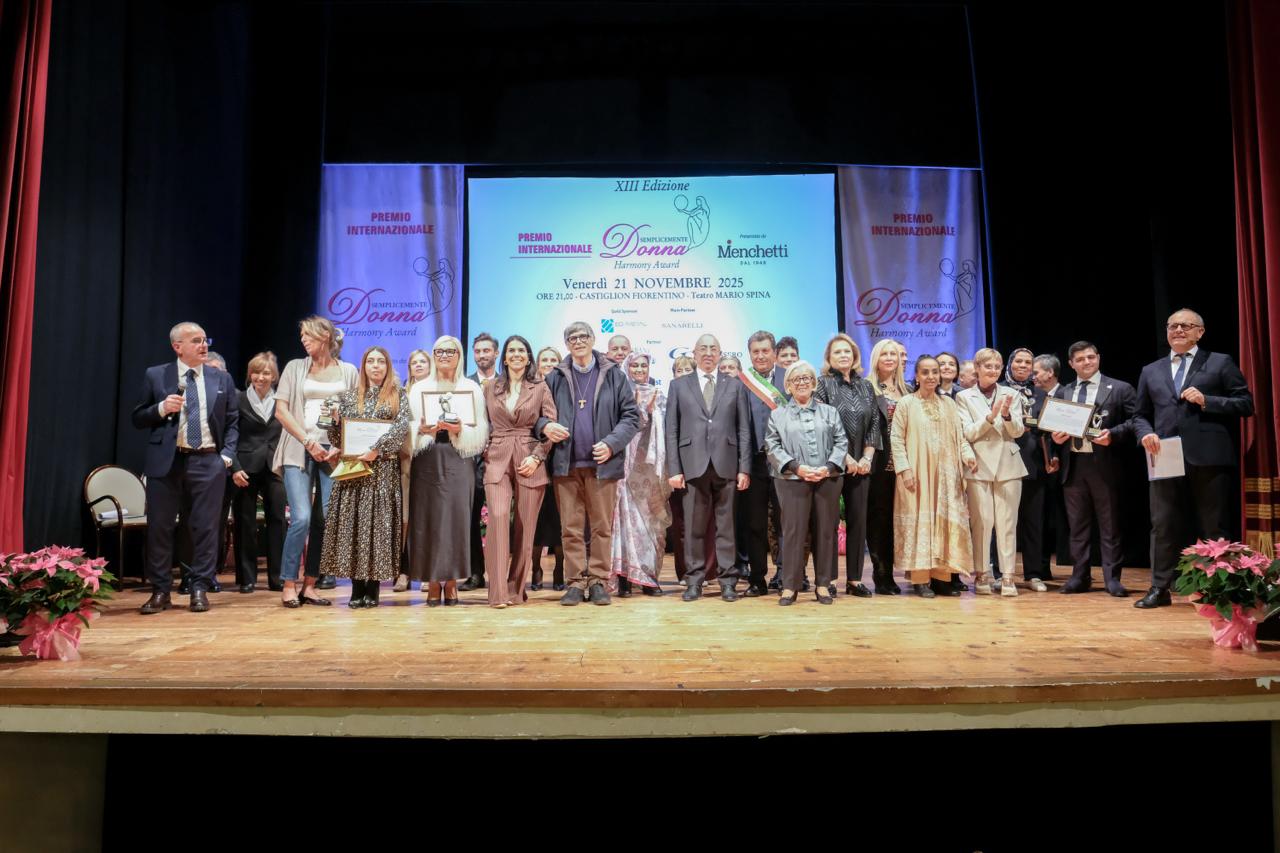La 13ª edizione del Premio Internazionale Semplicemente Donna – Harmony Award ha riempito ieri sera il Teatro Mario Spina di Castiglion Fiorentino fino all’ultimo posto, segnando un nuovo straordinario successo per una manifestazione che, anno dopo anno, si conferma molto più di un semplice evento: un luogo di emozioni, testimonianze e impegno collettivo. La serata si è aperta con le dolci note della cantautrice Novella, capaci di accarezzare il pubblico prima di lasciare spazio a una delle verità più dure e urgenti del nostro tempo: i dati sulle donne vittime di violenza, 90 nel 2024 e 76 fin qui nel 2025, con 6 casi ancora in fase di accertamento. Un silenzio carico di dolore ha preceduto la conduzione sensibile e rispettosa di Guido Albucci e Giacomo Marinelli Andreoli, che hanno accompagnato il pubblico in un viaggio fatto di coraggio, vulnerabilità e rinascita.