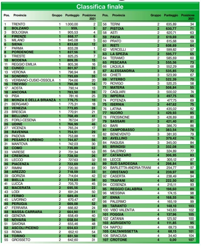 In Toscana è ancora Firenze a svettare: sale di due posizioni rispetto all’anno scorso, dal sesto al quarto posto. Sale anche Siena, che dal dodicesimo posto arriva alla sesta posizione. La terza città toscana in graduatoria è Pisa, che sale dal 25° al 19° posto. Arezzo 38^ (era al numero 33) perde 5 posti, situazione di tutt’altro tenore rispetto alla rilevazione di un anno fa, quando era in risalita di ben 15 posti dalla 48^. Lucca 41^ (era 45^), Livorno alla posizione 45 (era alla 47), Massa-Carrara alla posizione 48 (dalla 51). Scivolone anche per Grosseto che passa dal 31° al 55° posto. A chiudere la classifica toscana ci sono Pistoia (che però risale dal 71° al 57°) e Prato, che perde una posizione e passa dalla 59^ alla 60^ posizione.