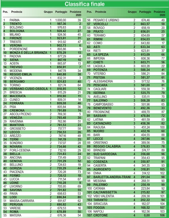 Le grandi città del Nord scalano la classifica della qualità della vita 2021, analizza il quotidiano economico Italia Oggi. Non a caso al primo posto si posiziona Parma, che guadagna ben 39 posizioni rispetto allo scorso anno. Un importante balzo in avanti lo fanno anche Torino, Milano, Trieste, Bologna e Firenze. Al contrario le realtà più piccole, e non solo quelle del Sud, sembrano quest’anno scivolare lungo un piano molto inclinato. Tra le province che perdono maggiori posizioni troviamo infatti Como, L’aquila, Belluno, Udine, Varese, Rovigo, Prato, Benevento, Fermo, Rieti e Nuoro. Il motivo di questo sconvolgimento è duplice: da una parte le metropoli hanno dimostrato di saper affrontare meglio la pandemia da Covid-19, tanto che, pur essendo state nel 2020 penalizzate da questa emergenza, nel 2021 hanno saputo riprendersi con maggior rapidità, dimostrando una resilienza più accentuata rispetto a quella dei centri di minori dimensioni. Il secondo motivo è metodologico: ci si è accorti infatti che la classifica degli anni scorsi finiva per sovrappesare un indicatore, quello della Popolazione (che contiene le classifiche di densità demografica, emigranti, morti in percentuale, immigrati, istruzione, nati vivi in percentuale, e numero medio dei componenti della famiglia) rispetto a tutti gli altri e si è deciso quindi di ridimensionarlo attribuendogli un peso uguale o di poco superiore ad Affari e lavoro, Ambiente, Sicurezza, Salute, Tempo libero e Reddito: probabilmente anche questo ha contributo a migliorare la posizione dei grandi centri rispetto ai piccoli.