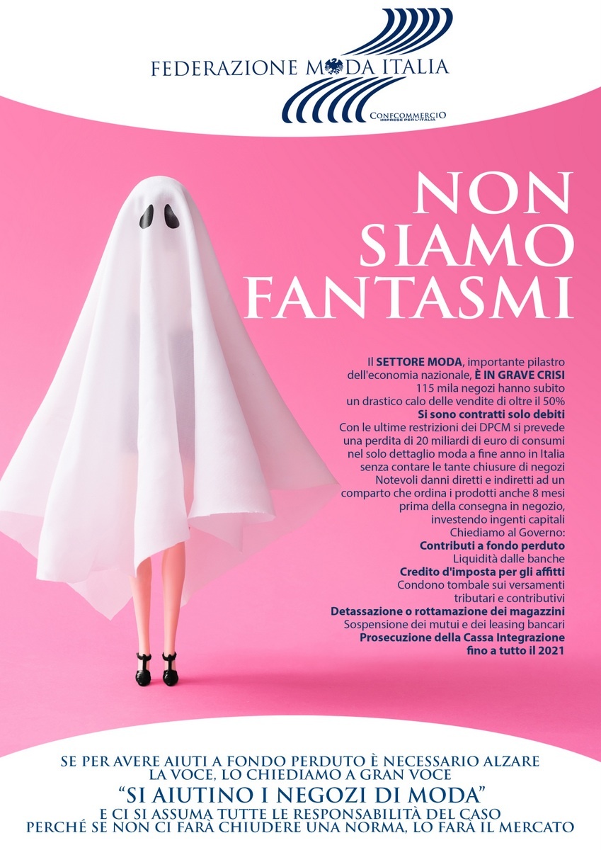 “Non siamo fantasmi” è lo slogan scelto da Federazione Moda Italia-Confcommercio per la sua campagna di sensibilizzazione rivolta alle istituzioni, Governo in primis. L’associazione, alla quale aderiscono le imprese del commercio al dettaglio e all’ingrosso di abbigliamento, calzature e pelletterie, reclama visibilità e tutela per la categoria, in considerazione della profonda crisi che la pandemia ha causato anche nel settore.