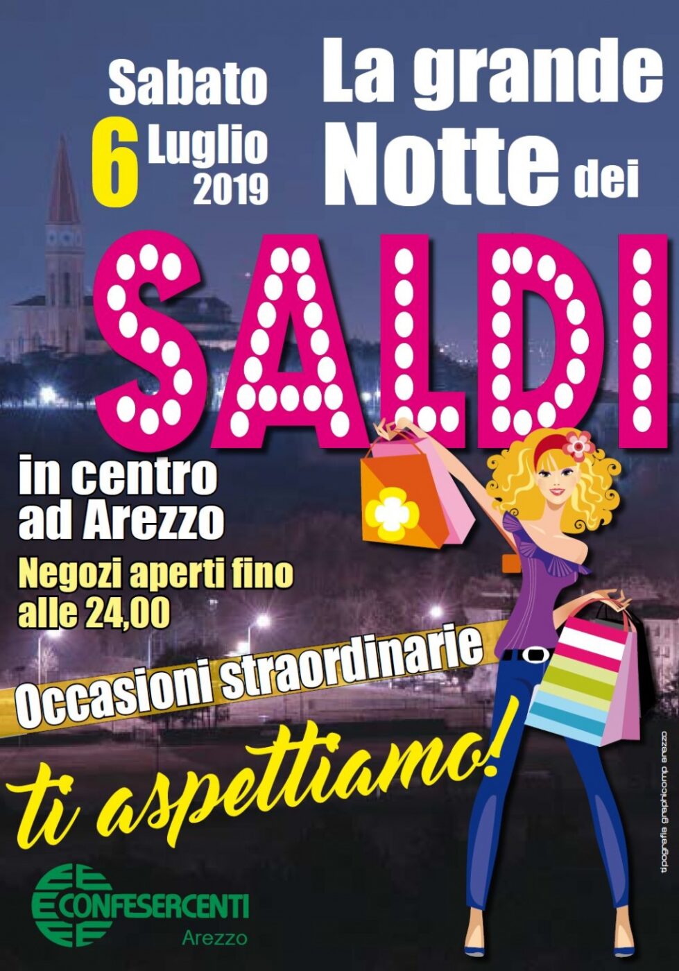 Anche ad Arezzo partono i saldi estivi di fine stagione con il tradizionale appuntamento della “Grande notte dei saldi”. Questo sabato 6 luglio le attività del centro storico rimarranno aperte fino alla mezzanotte. Un evento atteso dai consumatori che approfitteranno dello shopping serale per glio acquisti a prezzi scontati. Ecco le stime di Confesercenti che prevedono uno sprint dopo mesi di deludenti vendite a causa del tempo che ha frenato i consumatori. Si parte subito con interessanti percentuali di sconto dal 30% per salire fino al 50%.