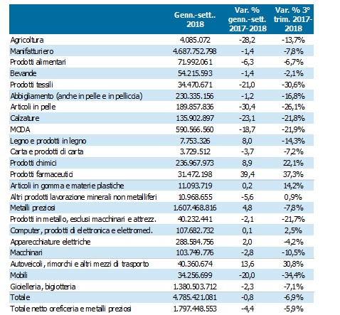 Il bilancio dei metalli preziosi – commenta il Presidente della Camera di Commercio Massimo Guasconi – continua ad essere caratterizzato dal segno positivo (+4,8%) anche se, anche in questo caso, il terzo trimestre è stato tutt’altro che positivo (-7,8%). Si tratta di una brusca inversione di tendenza, dopo due trimestri caratterizzati da brillanti performance (+10,6% nel primo trimestre e +16,8% nel secondo).