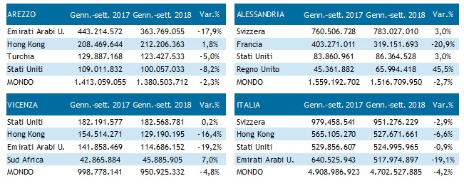 Il confronto con gli altri due distretti orafi nazionali mostra che il polo di Arezzo ha tenuto meglio degli altri due: Vicenza presenta infatti una contrazione del 4,8%, insieme ad Alessandria che cede il 2,7%.