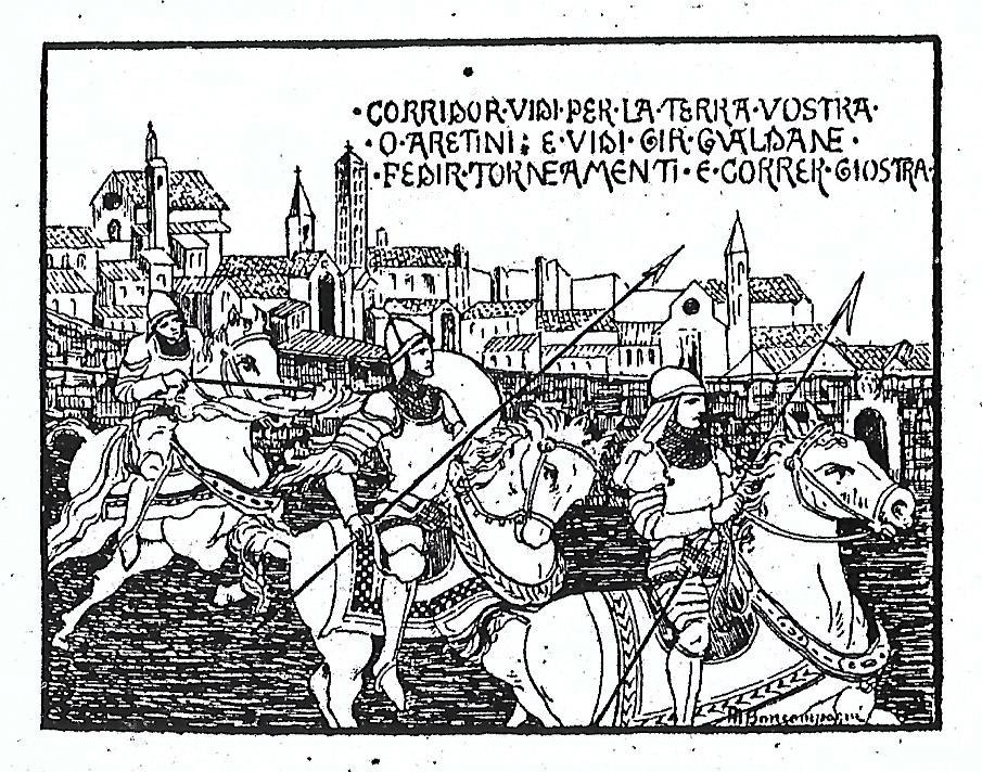 Autori dei saggi sono, nell’ordine, Gian Paolo Scharf (“Arezzo e Firenze nel Duecento: un rapporto contrastato”), Simone De Fraja (“La battaglia di Campaldino fra storia e mito”), Claudio Santori (“Dante e il territorio aretino nella vita di Dante”), Marco Bicchierai (“Il Casentino dei Conti Guidi nel periodo dantesco”), Franco Cristelli (“1921: anche Arezzo incorona Dante ‘padre della Nazione’”), Luca Berti (“‘Vidi fedir torneamenti e correr giostra’: Dante e la ‘riesumazione’ del Saracino”), Giovanni Galli (“L’assoluzione postuma di Dante”).