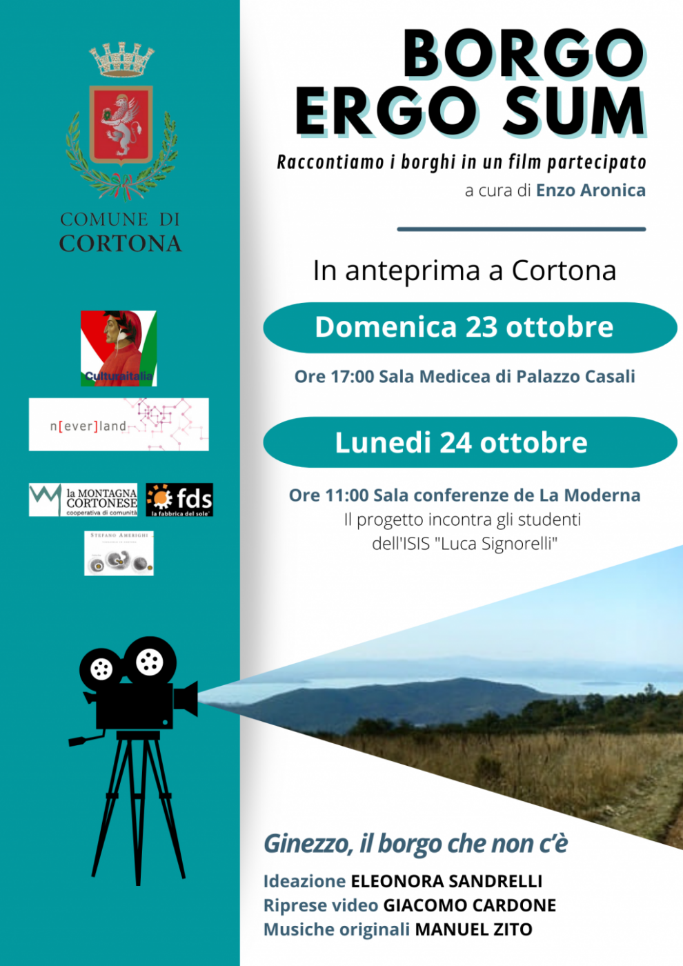 Dopo una fase in cui vari borghi si sono raccontati in maniera autonoma, spontanea attraverso gli abitanti o comunque i ‘protagonisti’ non professionisti delle varie zone d’Italia, adesso finalmente il progetto è giunto alla sua fase conclusiva, cioè alla proiezione pubblica nei luoghi dove ogni singola narrazione è iniziata. A Cortona verrà presentato appunto lo spezzone narrativo relativo a «Ginezzo, il borgo che non c’è» un viaggio a ritroso nel tempo ma anche nel futuro di questo luogo assai caro al cuore dei cittadini. Le interviste ai protagonisti di una Ginezzo della memoria e di una Ginezzo contemporanea saranno il centro del filmato con l’ideazione di Eleonora Sandrelli, le riprese a cura di Giacomo Cardone, in collaborazione con la Montagna Cortonese, La Fabbrica del Sole e Stefano Amerighi e la partecipazione straordinaria di Roberto Sarchielli, testimonial d’eccezione.