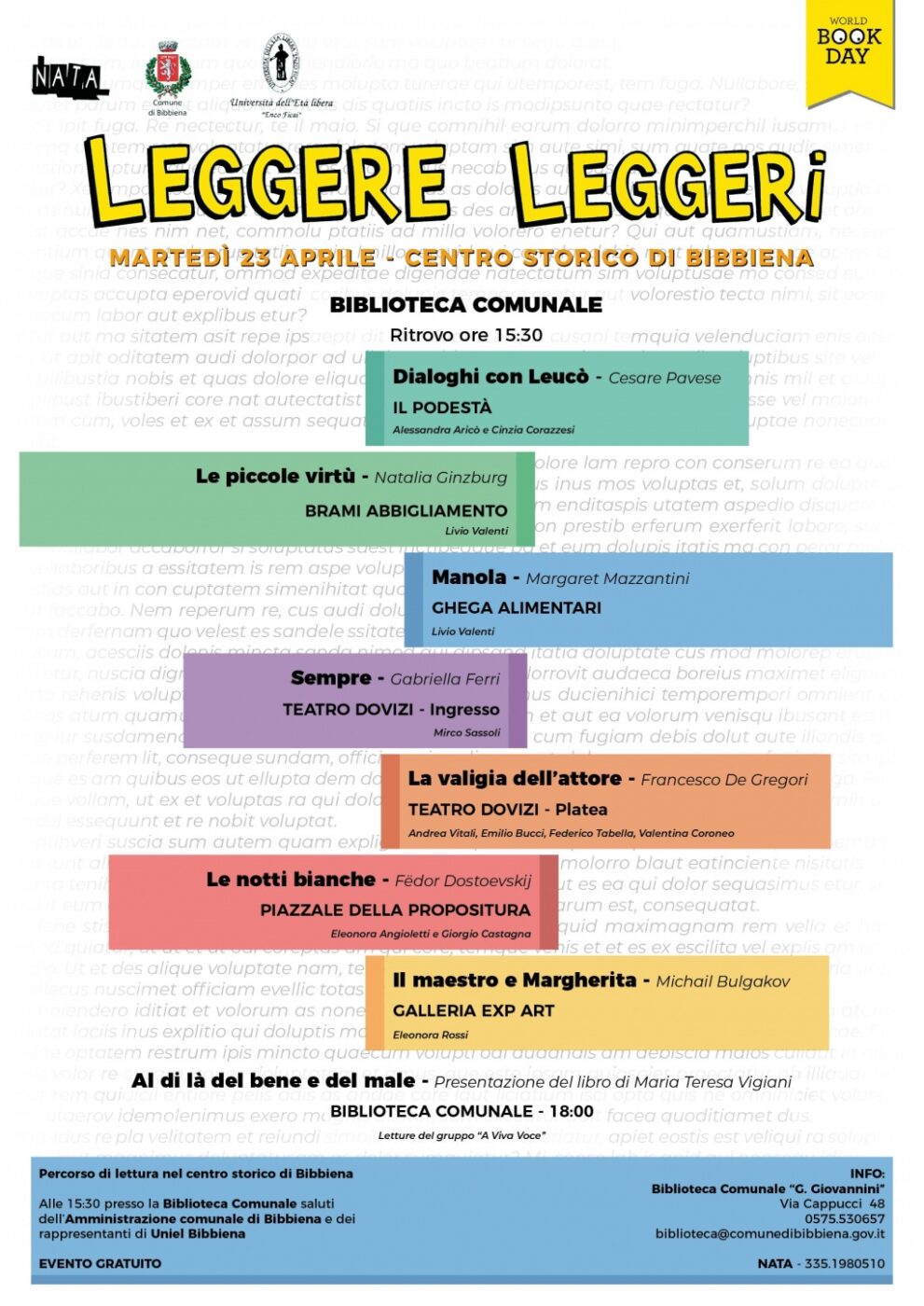 Un percorso molto legato alla Mostra del Libro per Ragazzi e a tutte le iniziative di promozione alla lettura che annualmente si tengono presso la Biblioteca Giovannini. Leggere, Leggeri, così riporta sulle lastre del centro storico le parole che si fanno percorso, vita e incora Bibbiena la città del libro.