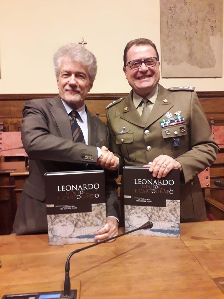 La liberalità del Capo di Stato Maggiore dell’Esercito, Generale Salvatore Farina, e la conoscenza specifica dell’Istituto Geografico Militare“, ha sottolineato il generale di Divisione Pietro Tornabene, comandante dell’Istituto Geografico Militare – Esercito Italiano, “hanno creato le giuste premesse per la ristampa di quest’opera che risponde alla richiesta da parte di un vasto pubblico di ammiratori e di cultori della figura di Leonardo in ambito cartografico e geografico. Ancora oggi, a distanza di 16 anni dalla sua prima apparizione, il volume mostra un inossidabile valore culturale, unito al suo originario pregio editoriale. Il Genio Universale, che abilmente ha saputo coniugare arte e scienza, non si è manifestato solo nelle meravigliose tavole anatomiche che tutti abbiamo ammirato ma, con una prescienza scientifica che ha del miracoloso, si è applicato all’ambito cartografico con soluzioni tecnico-scientifiche che sono state compiutamente acquisite solo alla fine del Settecento. Genialità, scienza e tecnica si fondono mirabilmente in Leonardo e questo volume ce ne fa scoprire una parte ancora poco conosciuta ai più“.