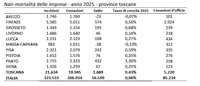 Nel 2025 in provincia di Arezzo sono nate 1.746 nuove imprese e ne sono state chiuse (escluse quelle d’ufficio) 1.769, con un saldo negativo di 23 imprese.