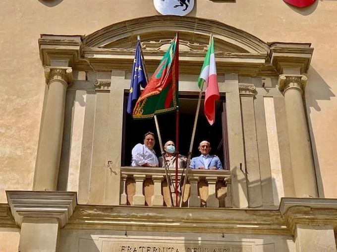 Il Primo Rettore Pier Luigi Rossi e il Magistrato di Fraternita hanno deciso di esporre la bandiera del Quartire di Porta Crucifera, vincitore dell’ultima edizione della Giostra del