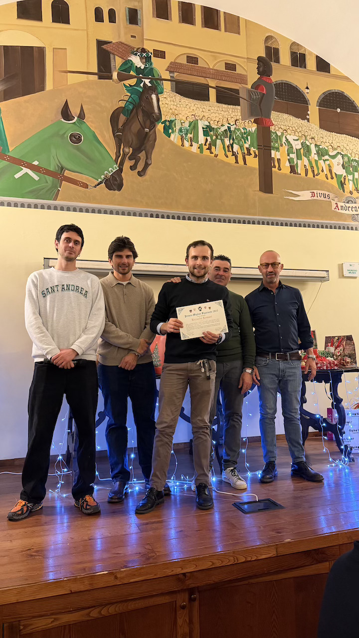 Nell’occasione è stato consegnato dalla dirigenza bianco verde il premio quale miglior figurante per l’anno 2025 a Riccardo Romani, classe 2002, con la seguente motivazione: “Giovane e appassionato Quartierista, si riconosce in lui un profondo e costante attaccamento ai colori di Porta Sant’Andrea. La sua presenza si è sempre distinta per serietà e dedizione, qualità che ne hanno fatto una figura di valore in piazza Grande e in ogni ambito del Quartiere, in particolare nella Scuderia, rappresentando per tutti un punto di riferimento. Con le sue qualità umane e la sua passione dimostrata nel corso degli anni ha guadagnato la piena stima della Dirigenza, che lo riconosce come esempio di impegno e senso di appartenenza, conferendogli questo premio con merito”. Il premio, una pergamena, è stato consegnato dal rettore Maurizio Carboni e dal capitano Andrea Gavagni insieme al Maestro d’Armi Claudio Guerri e all’aiuto regista Francesco Torzoni.