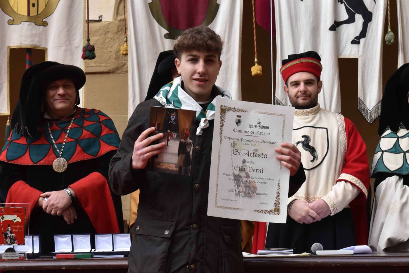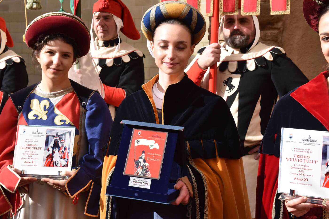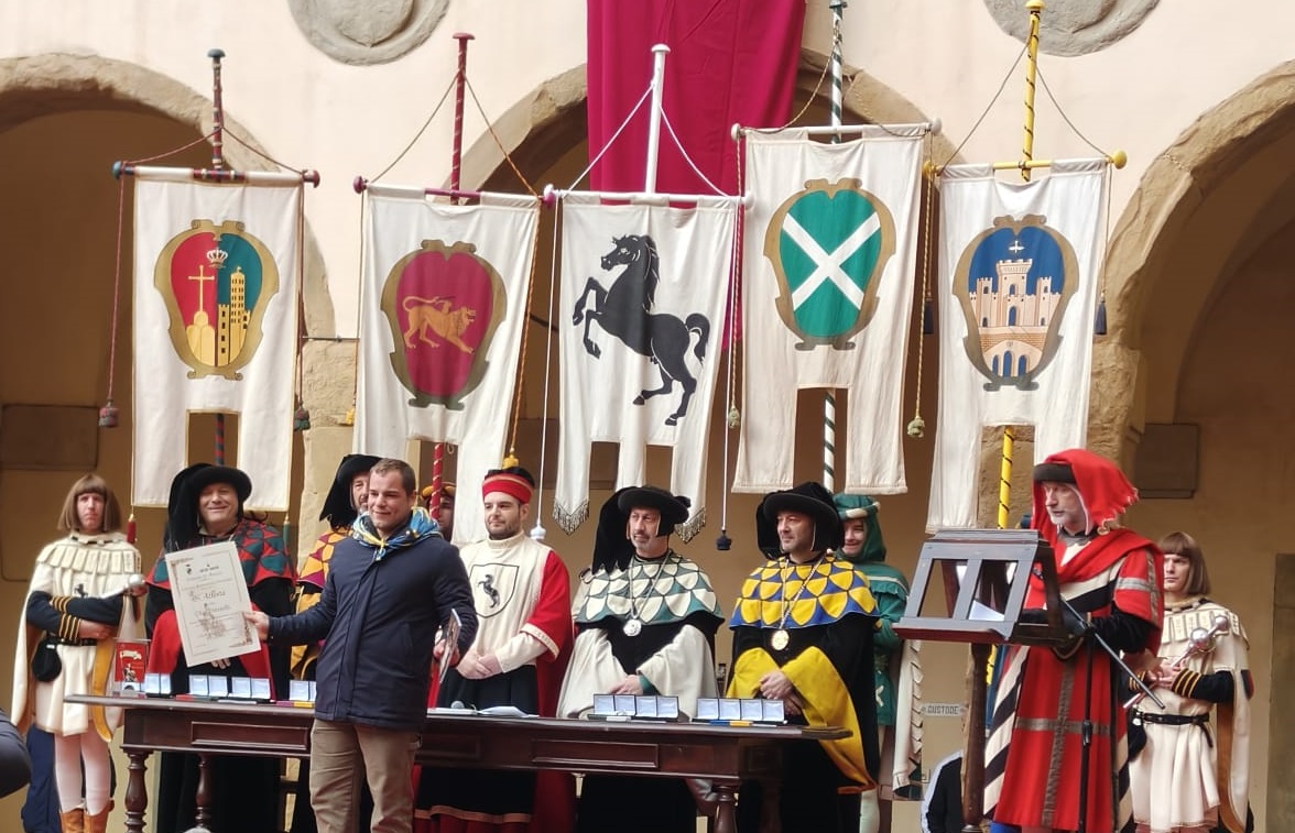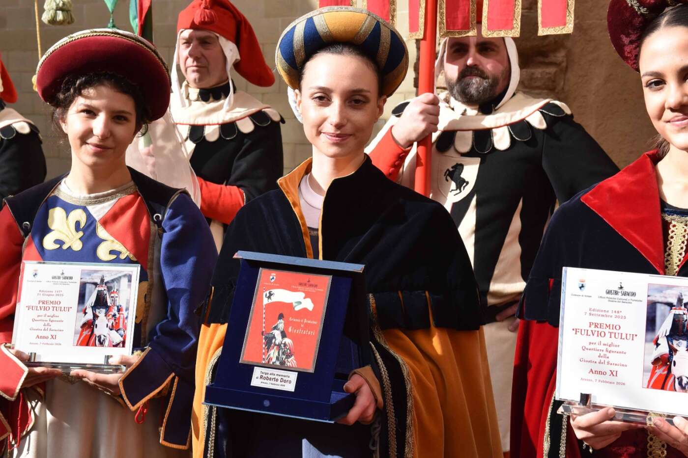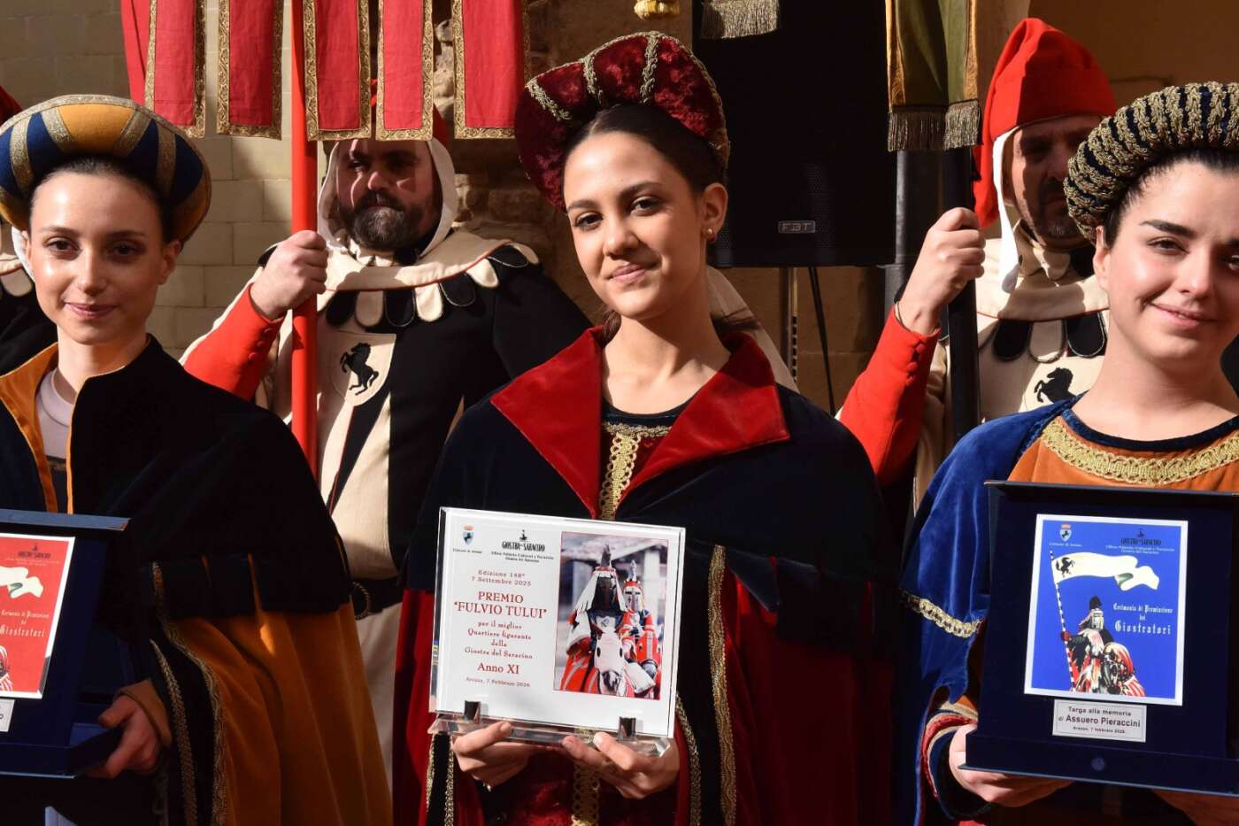 Dopo l’introduzione dell’assessore ha preso avvio la solenne cerimonia con la consegna del Premio “Fulvio Tului”, giunto all’undicesima edizione e consegnato ai quartieri che hanno sfilato meglio nelle edizioni 2025 della Giostra del Saracino: Porta del Foro a giugno, Porta Sant’Andrea a settembre. Presenti alcuni dei giudici del Premio Tului ai quali è stata assegnato un attestato in segno di riconoscimento.