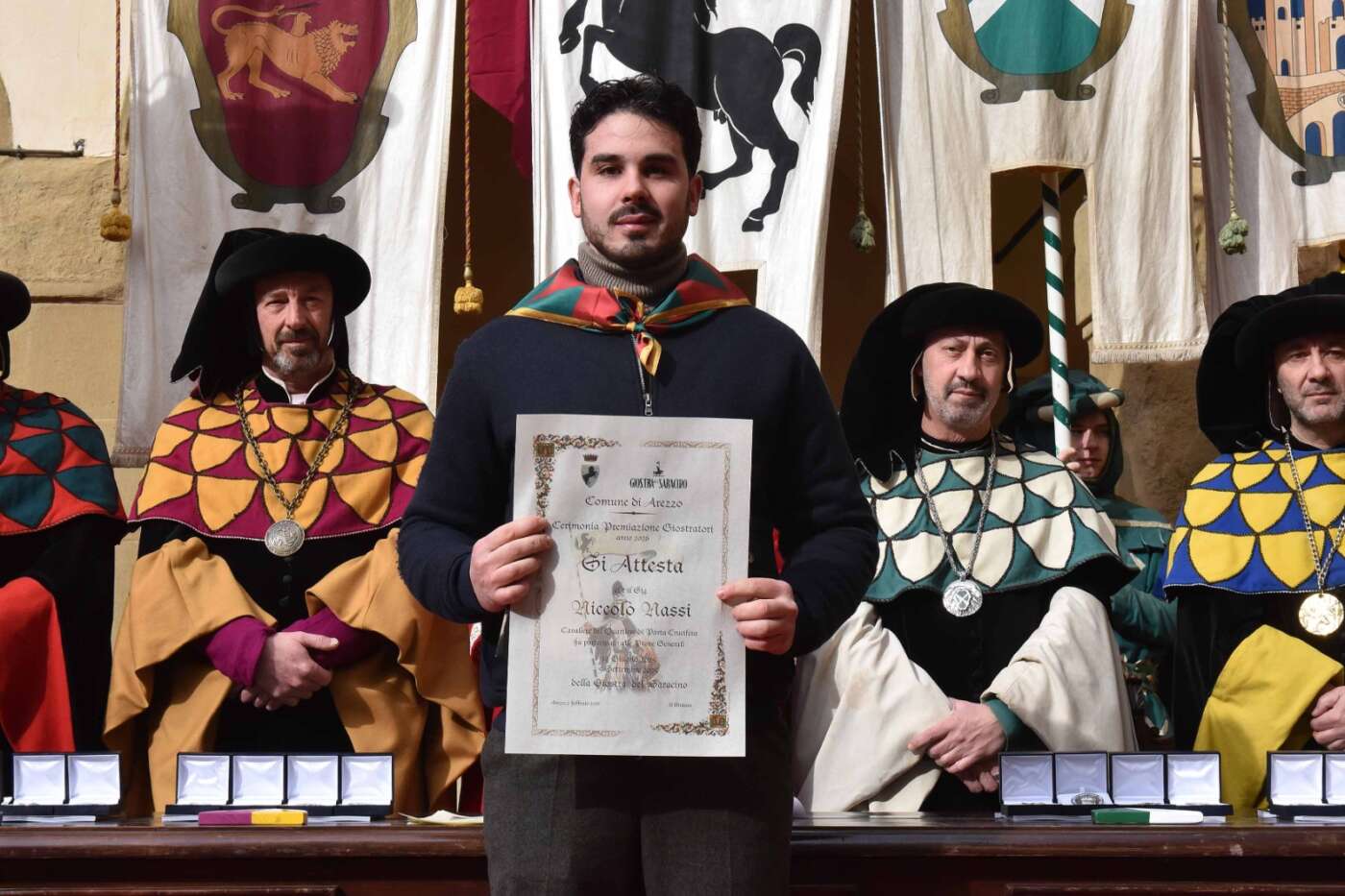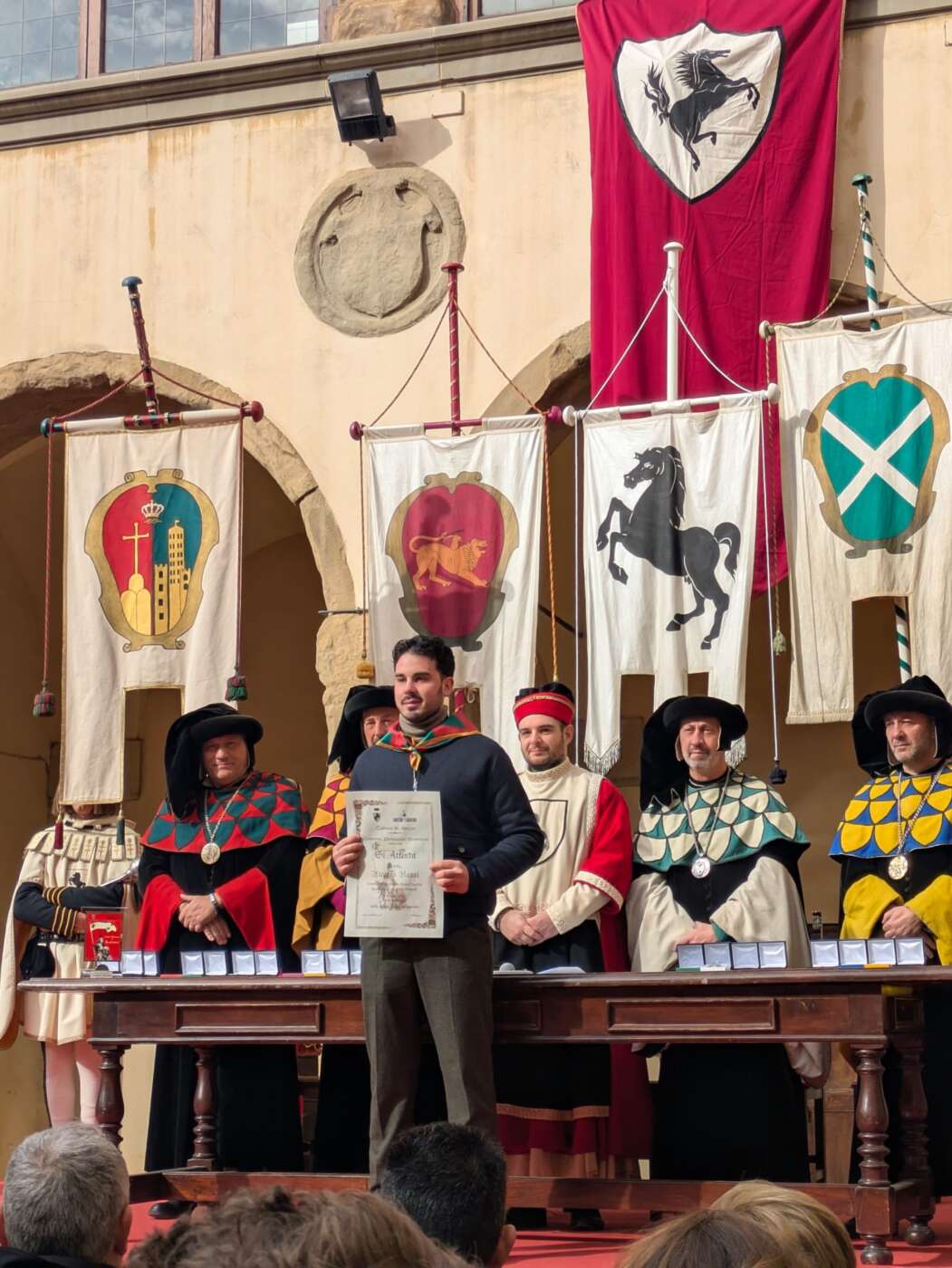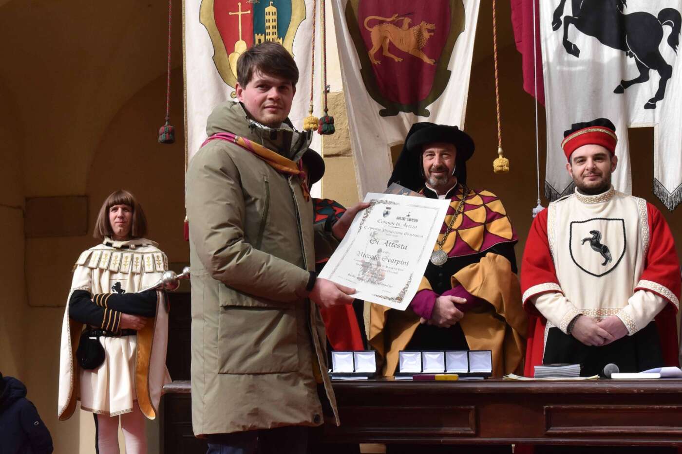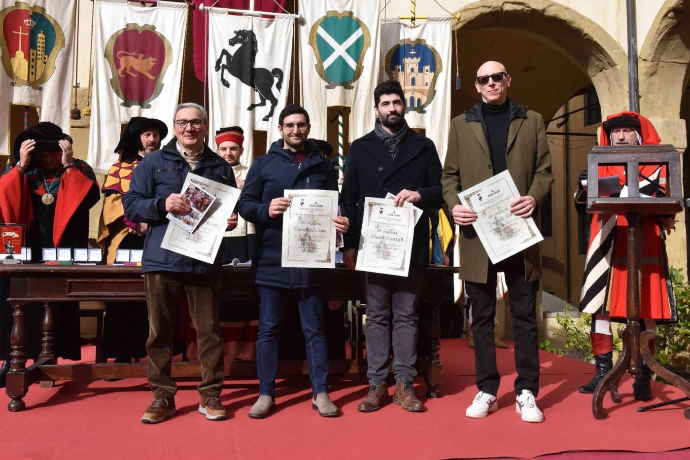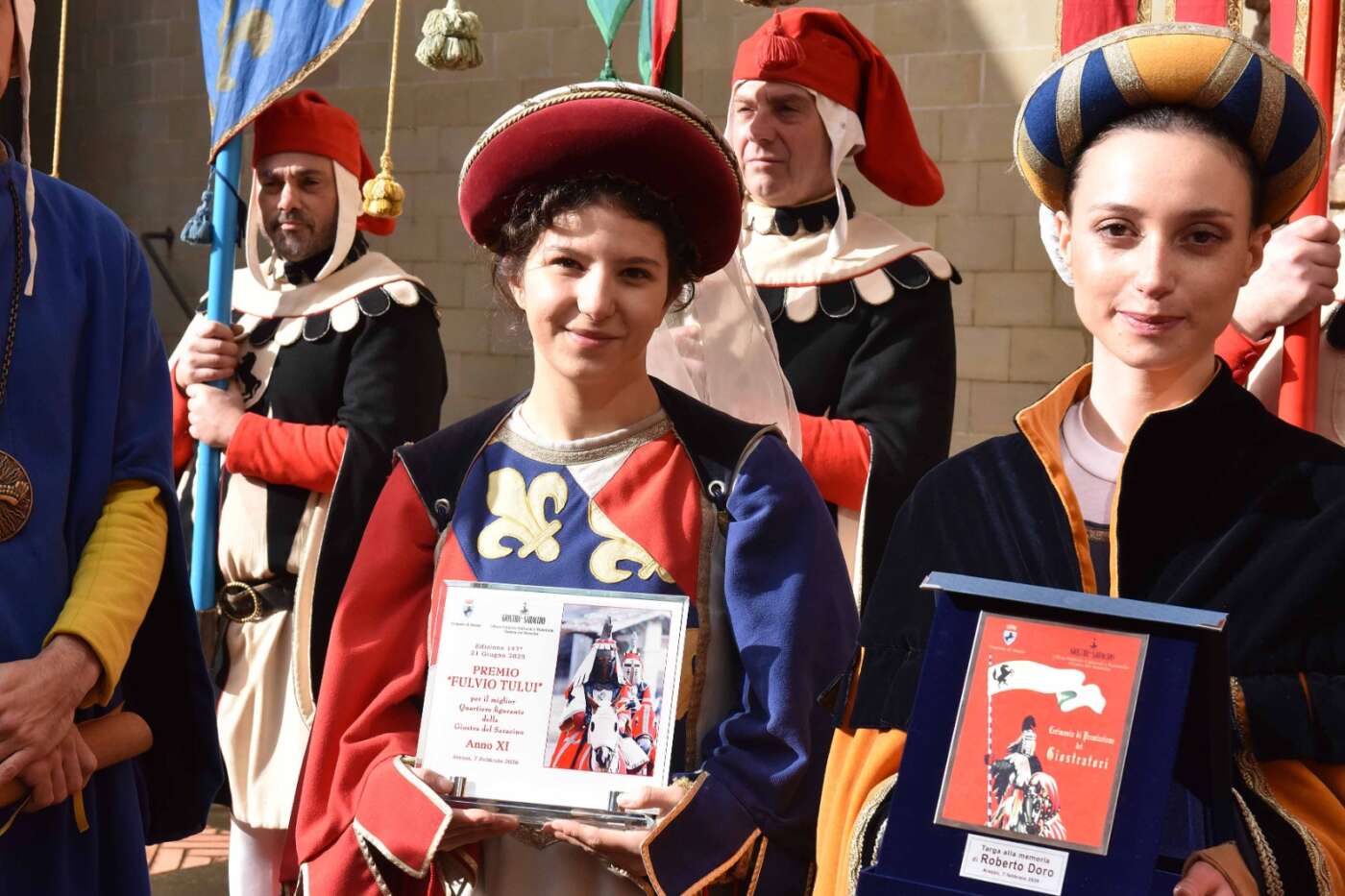 Dopo l’introduzione dell’assessore ha preso avvio la solenne cerimonia con la consegna del Premio “Fulvio Tului”, giunto all’undicesima edizione e consegnato ai quartieri che hanno sfilato meglio nelle edizioni 2025 della Giostra del Saracino: Porta del Foro a giugno, Porta Sant’Andrea a settembre. Presenti alcuni dei giudici del Premio Tului ai quali è stata assegnato un attestato in segno di riconoscimento.