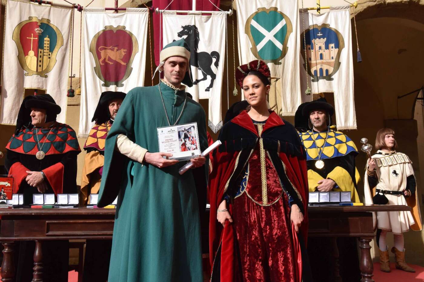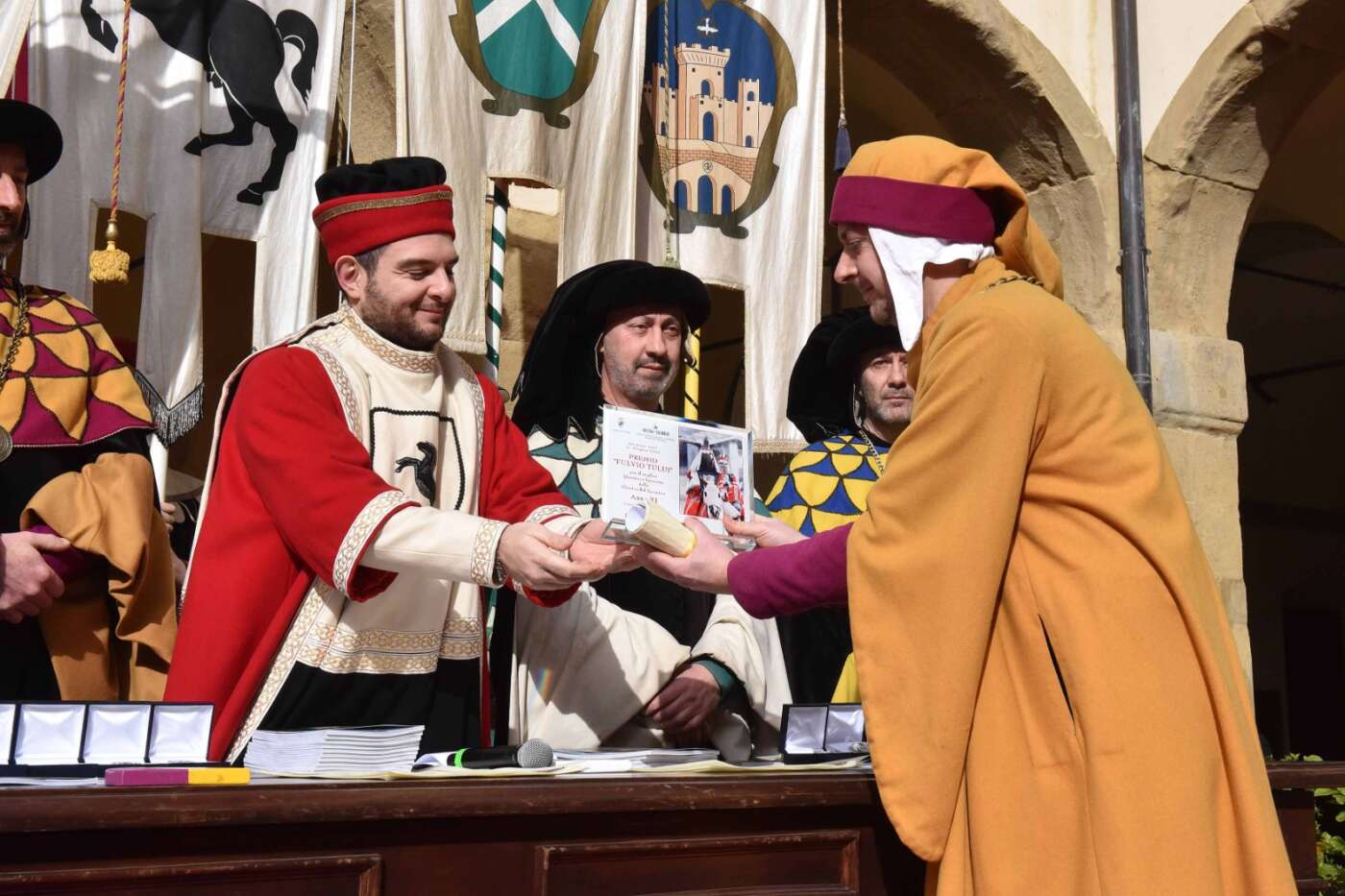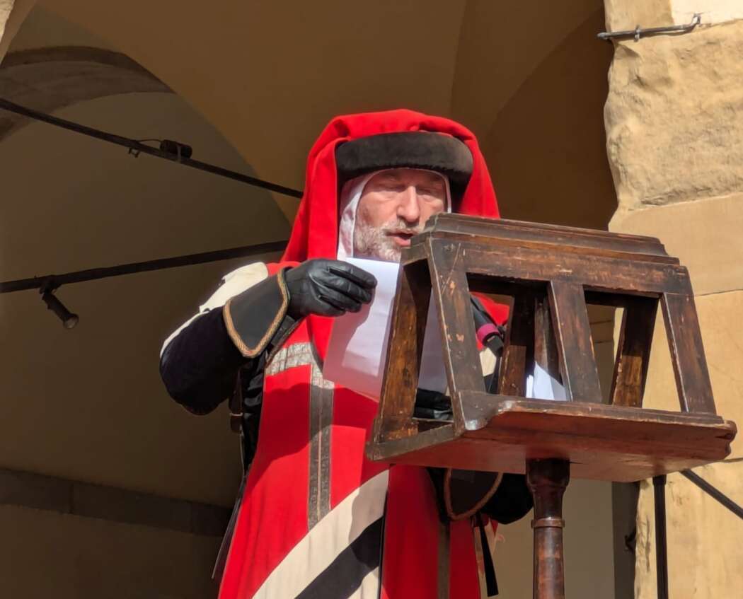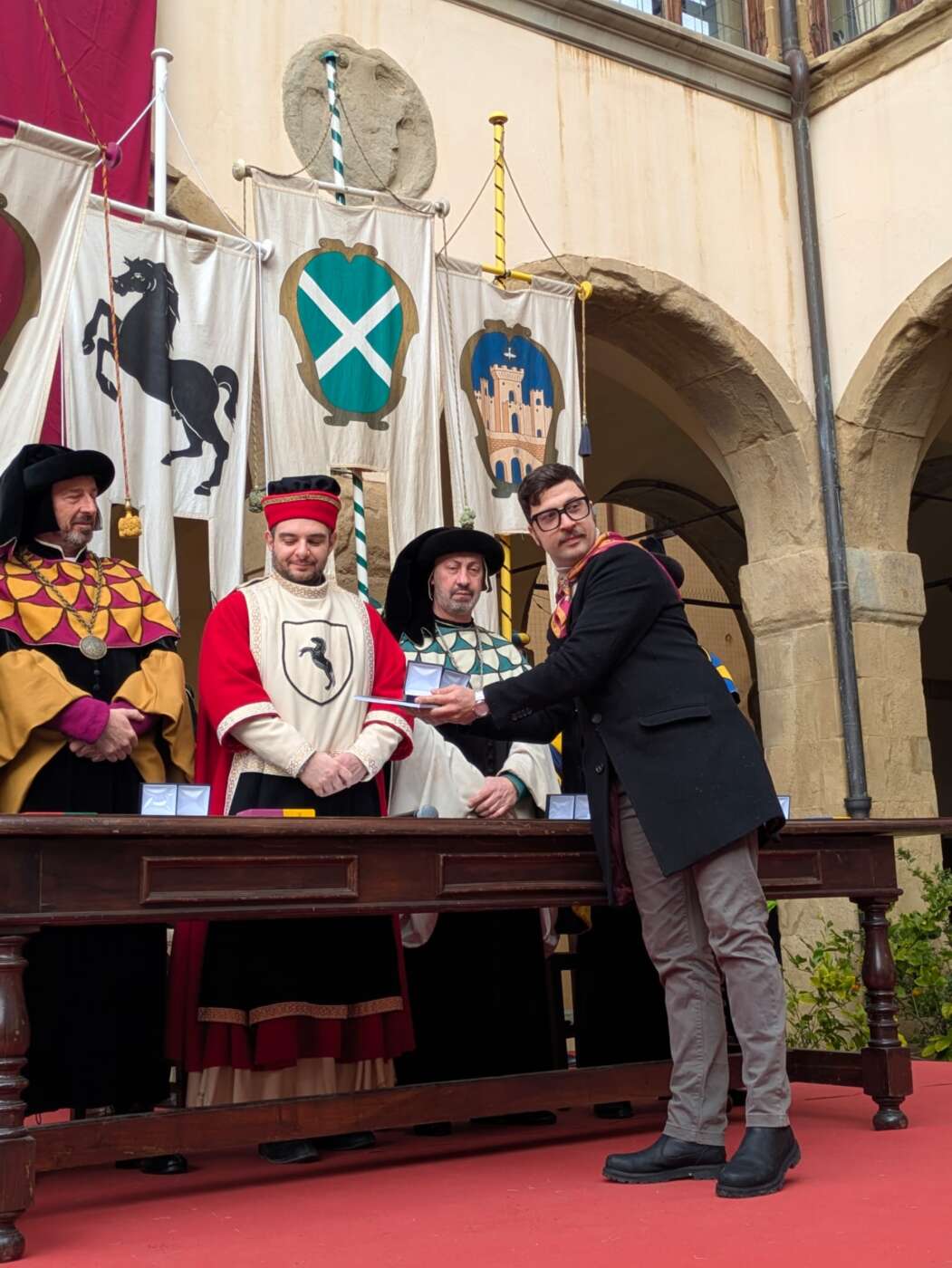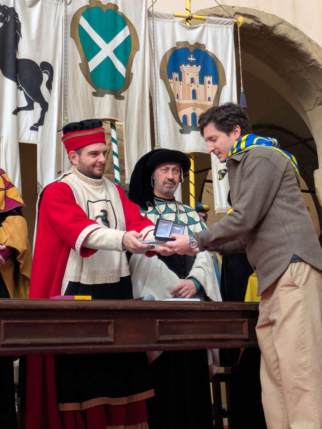 Dopo l’introduzione dell’assessore ha preso avvio la solenne cerimonia con la consegna del Premio “Fulvio Tului”, giunto all’undicesima edizione e consegnato ai quartieri che hanno sfilato meglio nelle edizioni 2025 della Giostra del Saracino: Porta del Foro a giugno, Porta Sant’Andrea a settembre. Presenti alcuni dei giudici del Premio Tului ai quali è stata assegnato un attestato in segno di riconoscimento.