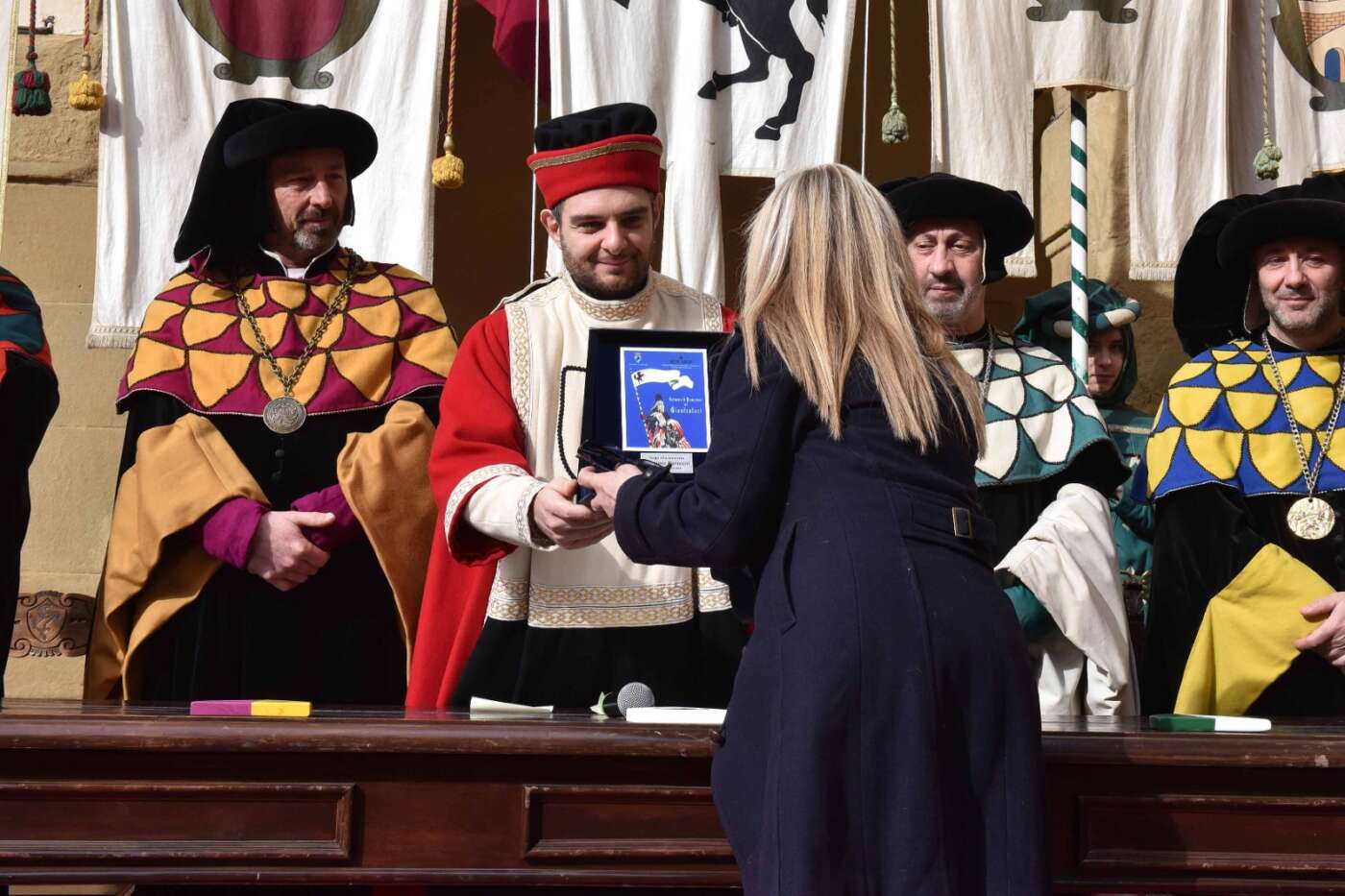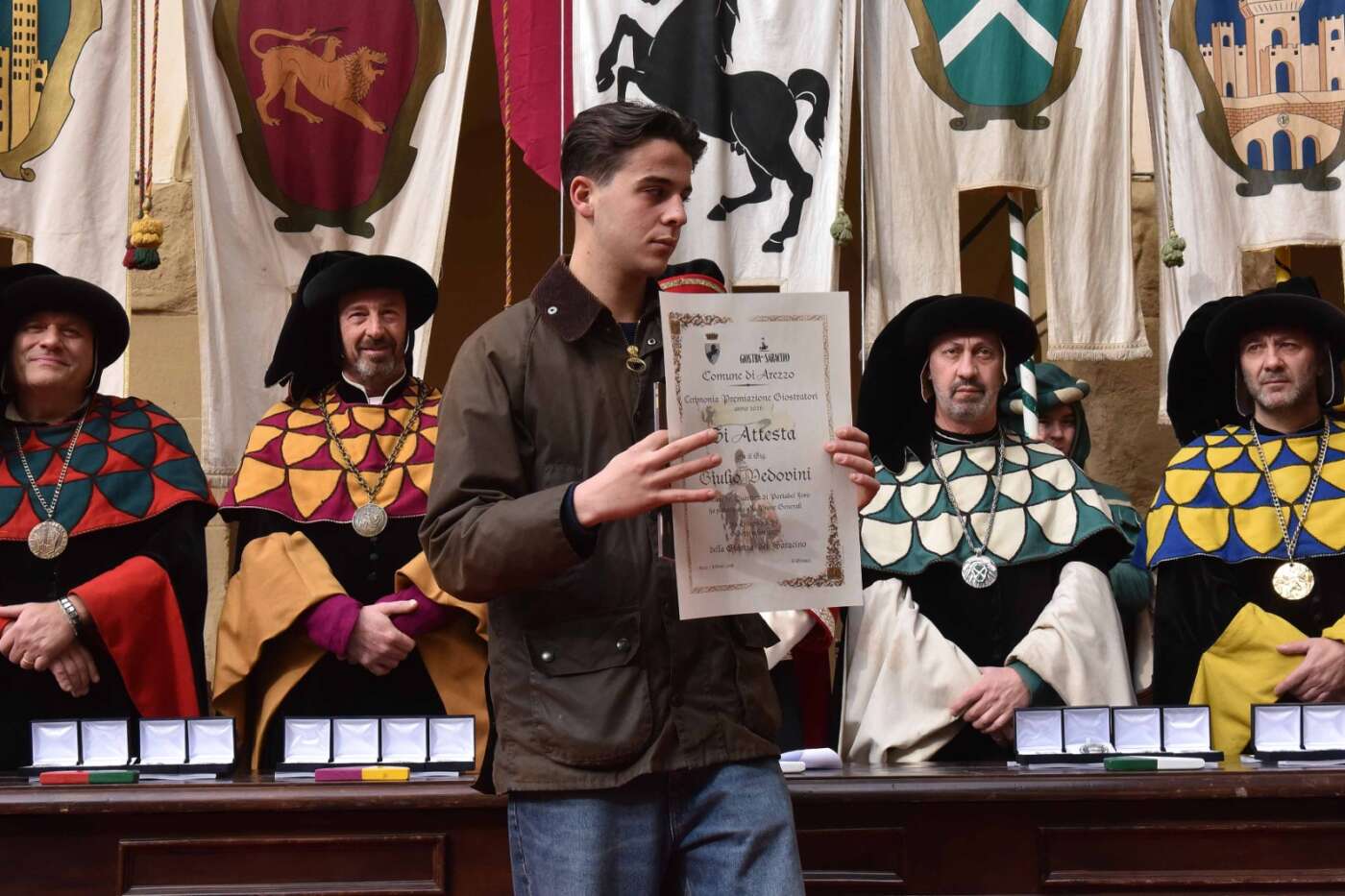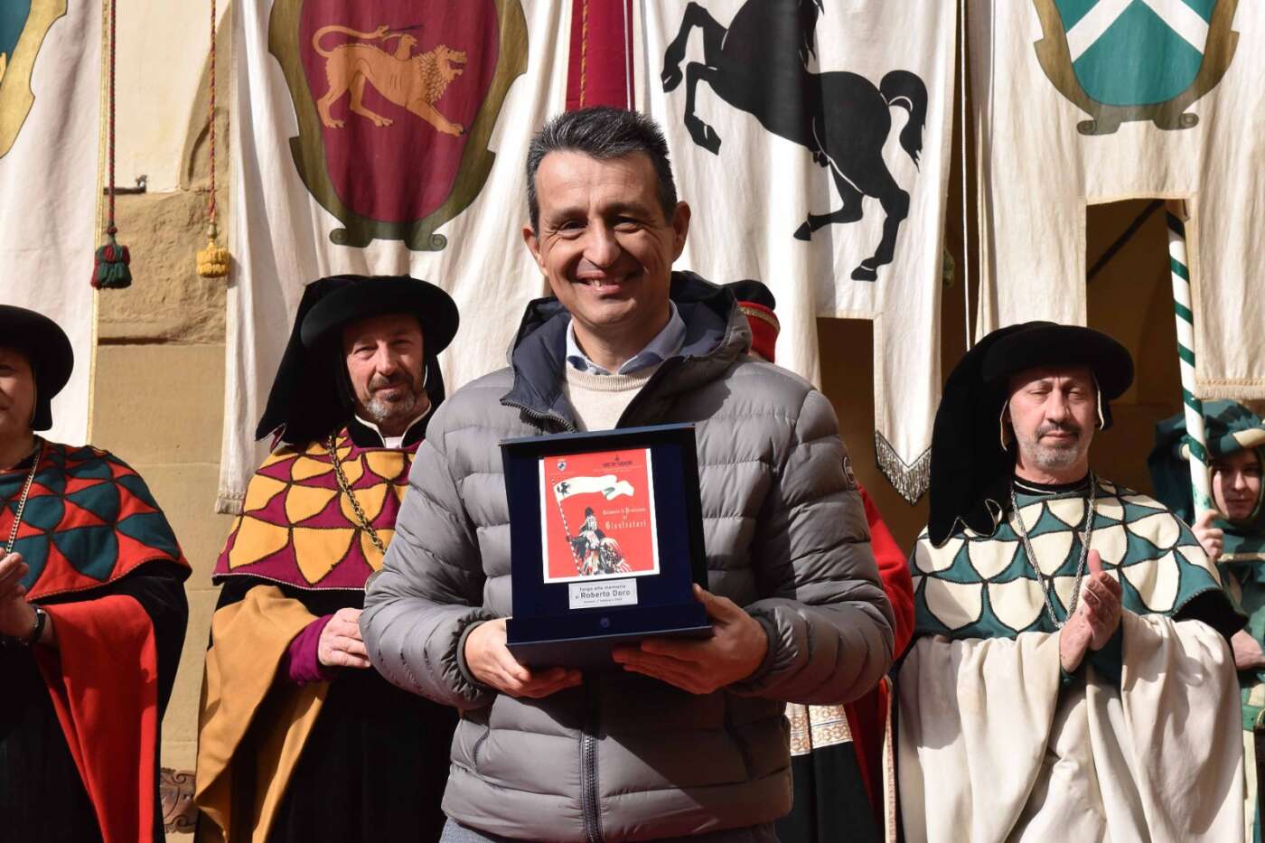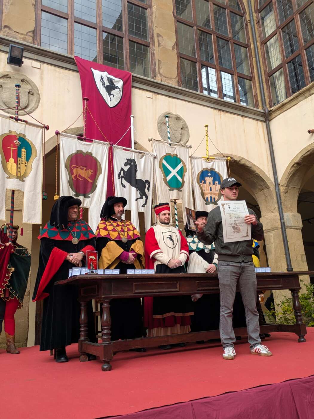 Dopo l’introduzione dell’assessore ha preso avvio la solenne cerimonia con la consegna del Premio “Fulvio Tului”, giunto all’undicesima edizione e consegnato ai quartieri che hanno sfilato meglio nelle edizioni 2025 della Giostra del Saracino: Porta del Foro a giugno, Porta Sant’Andrea a settembre. Presenti alcuni dei giudici del Premio Tului ai quali è stata assegnato un attestato in segno di riconoscimento.