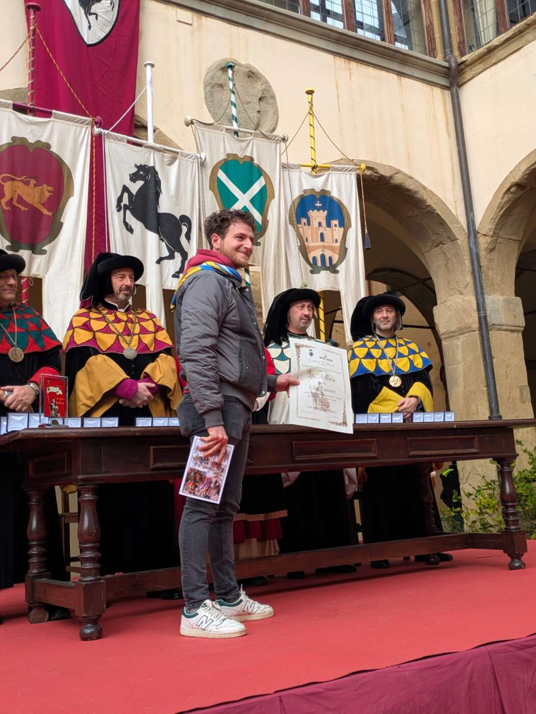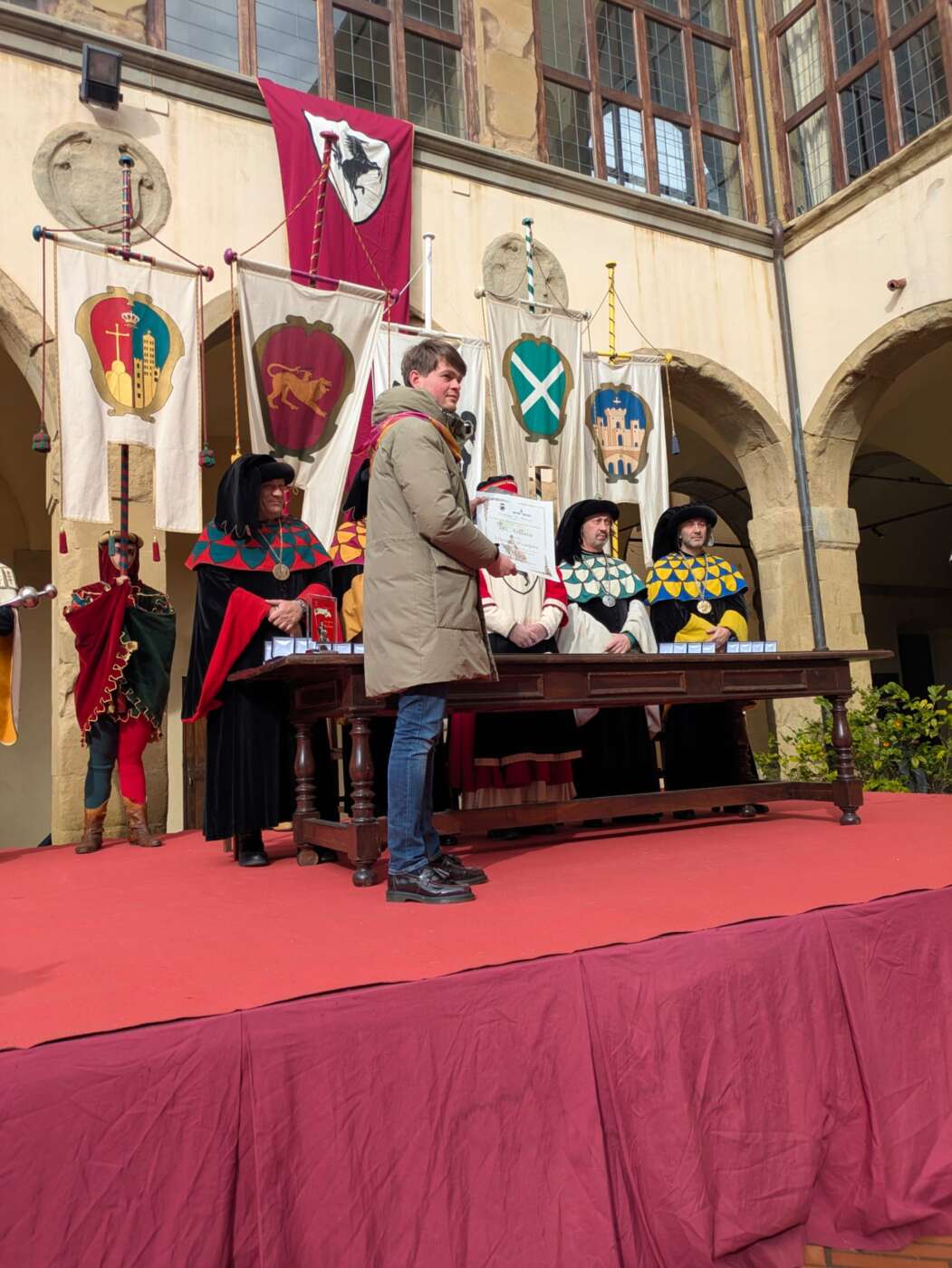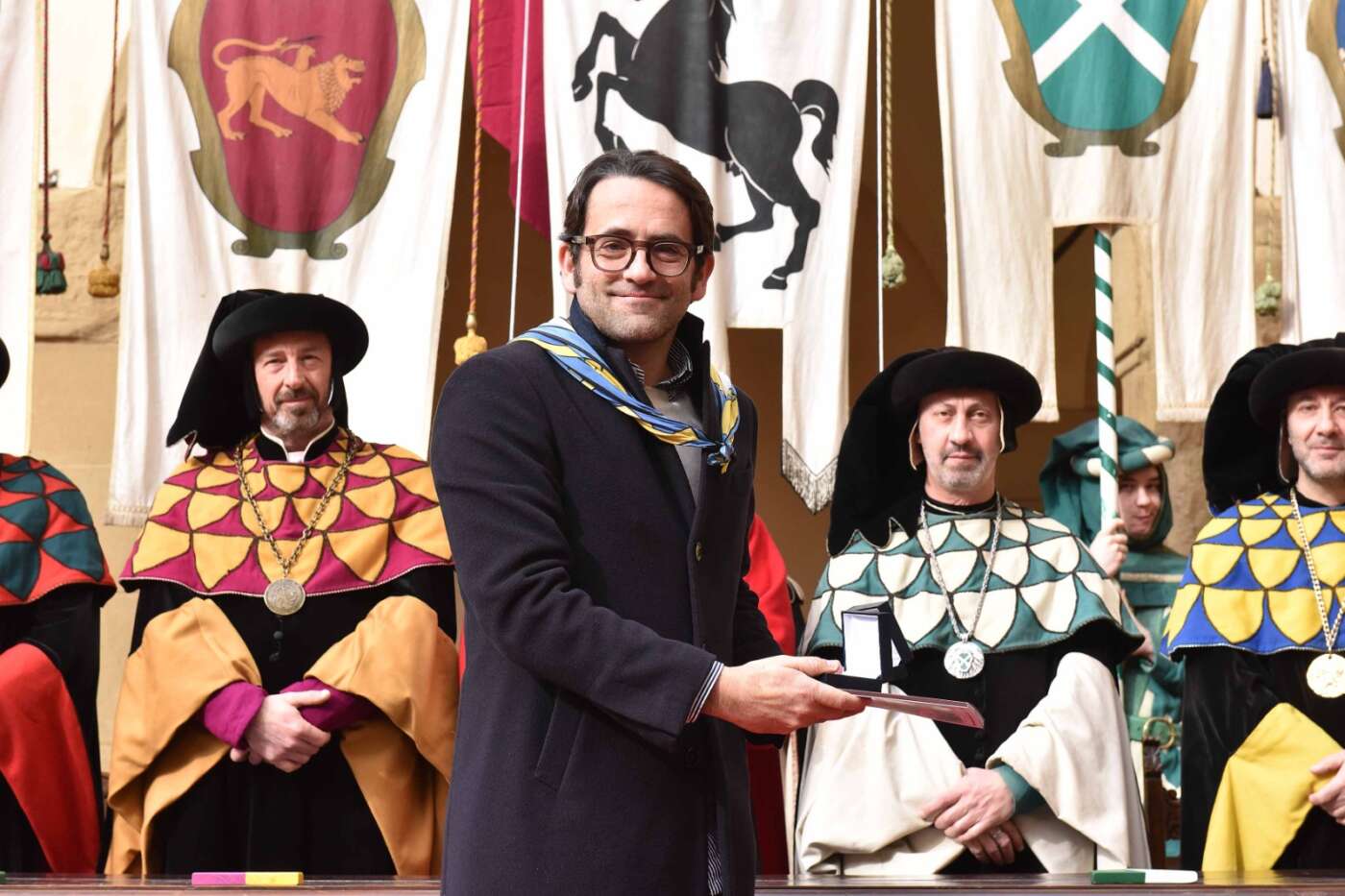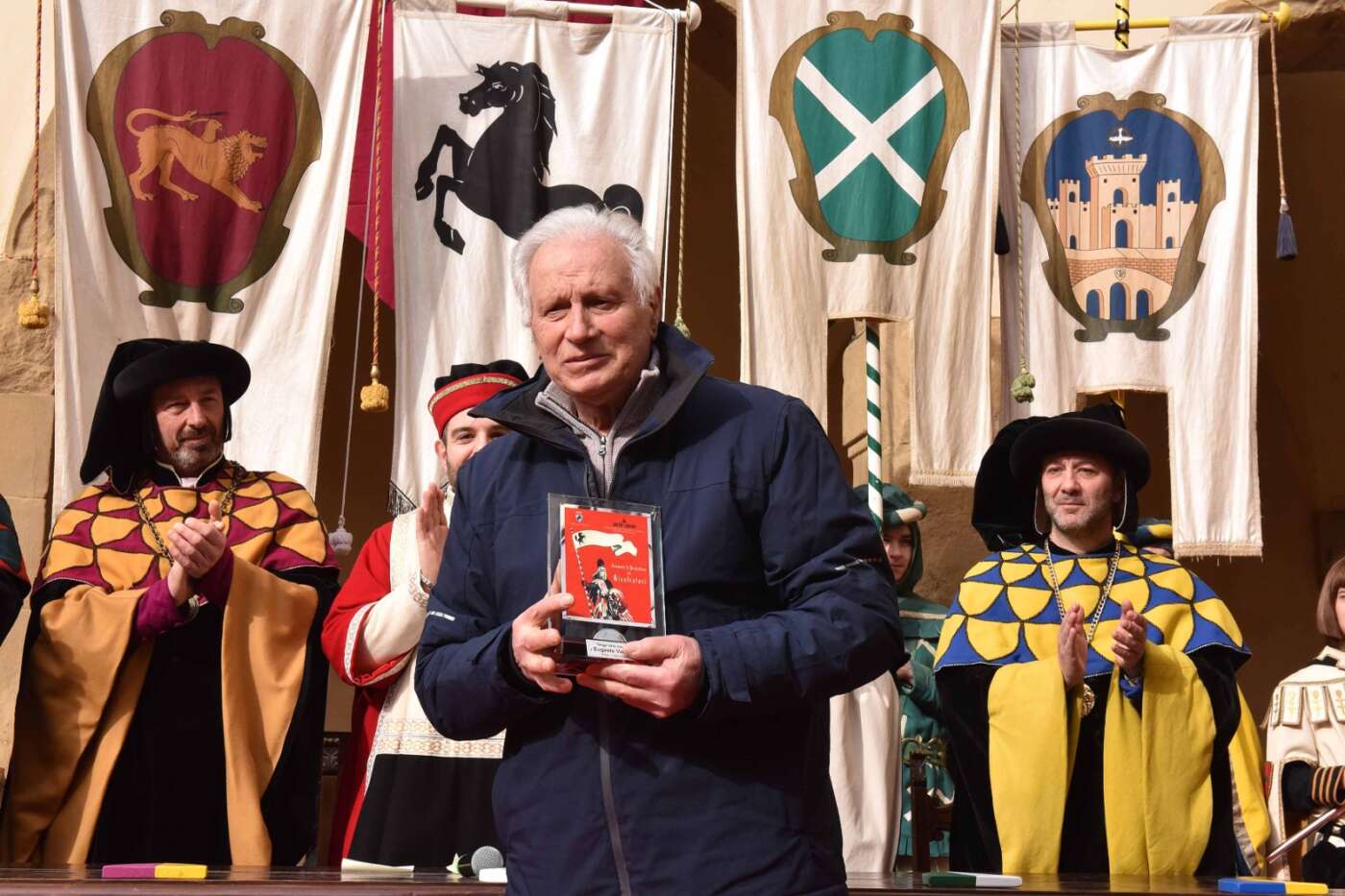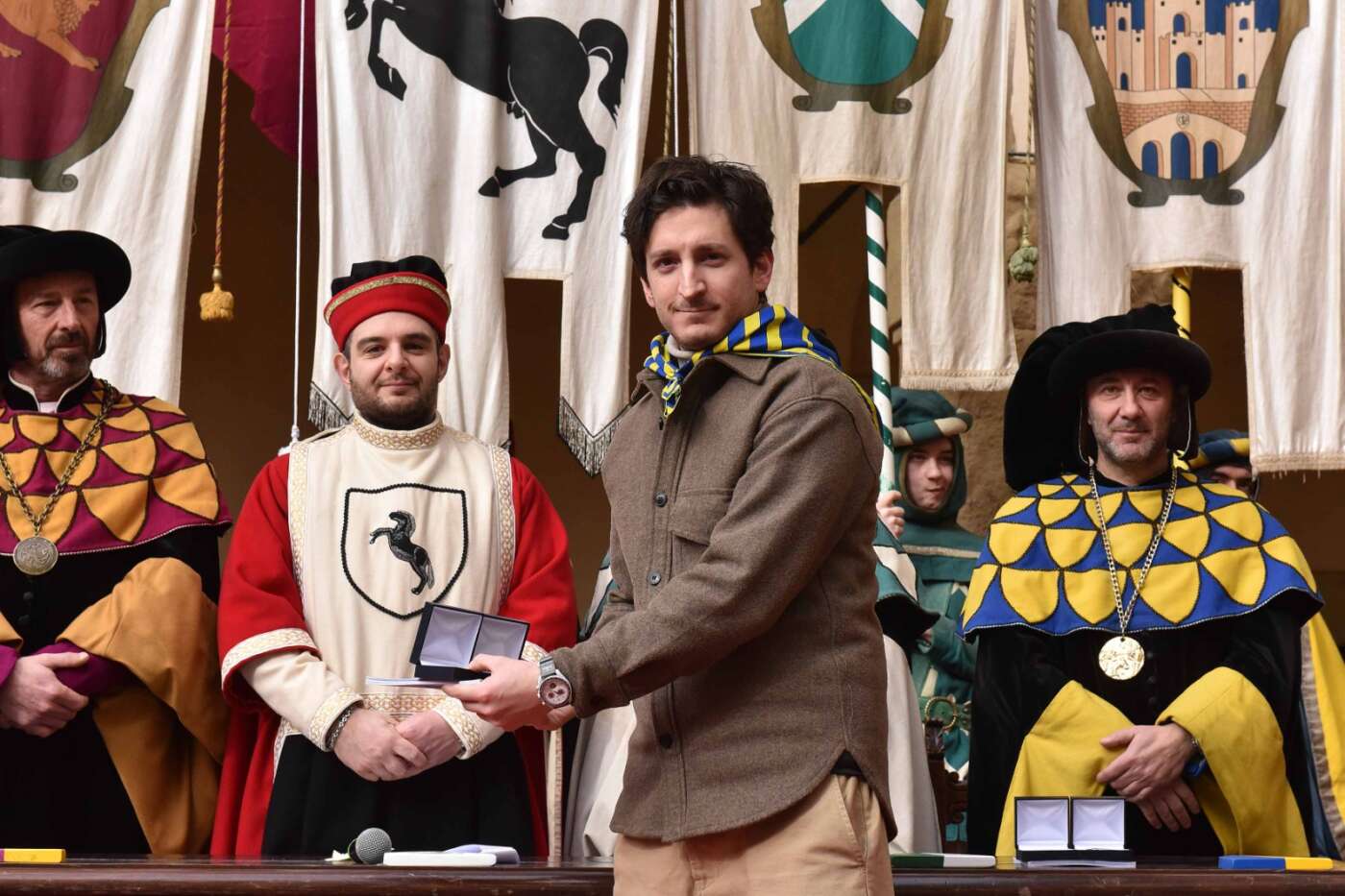 Dopo l’introduzione dell’assessore ha preso avvio la solenne cerimonia con la consegna del Premio “Fulvio Tului”, giunto all’undicesima edizione e consegnato ai quartieri che hanno sfilato meglio nelle edizioni 2025 della Giostra del Saracino: Porta del Foro a giugno, Porta Sant’Andrea a settembre. Presenti alcuni dei giudici del Premio Tului ai quali è stata assegnato un attestato in segno di riconoscimento.