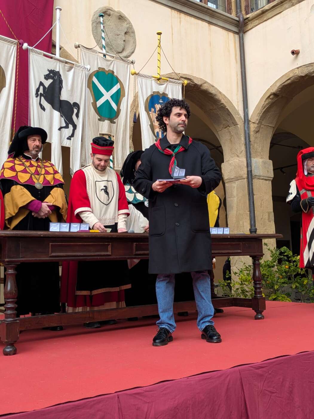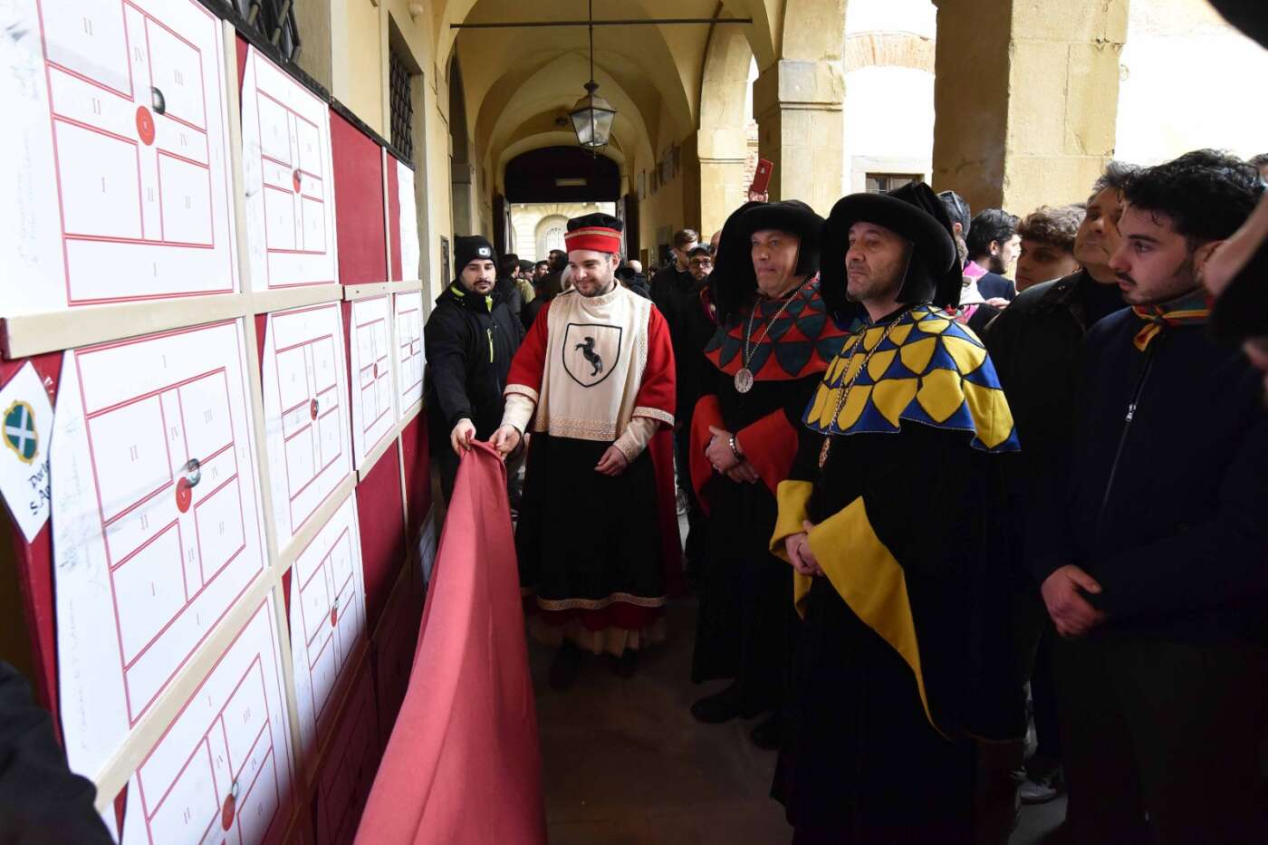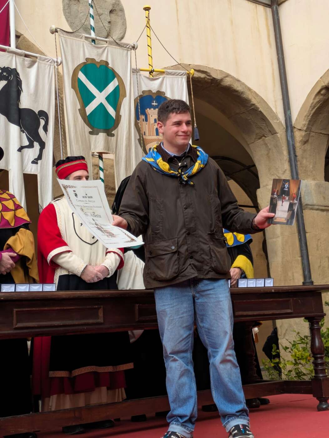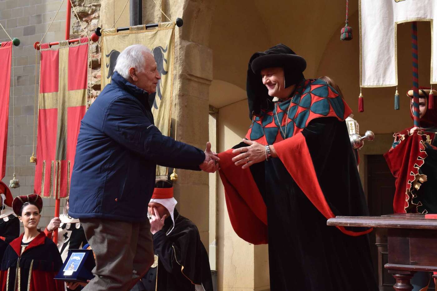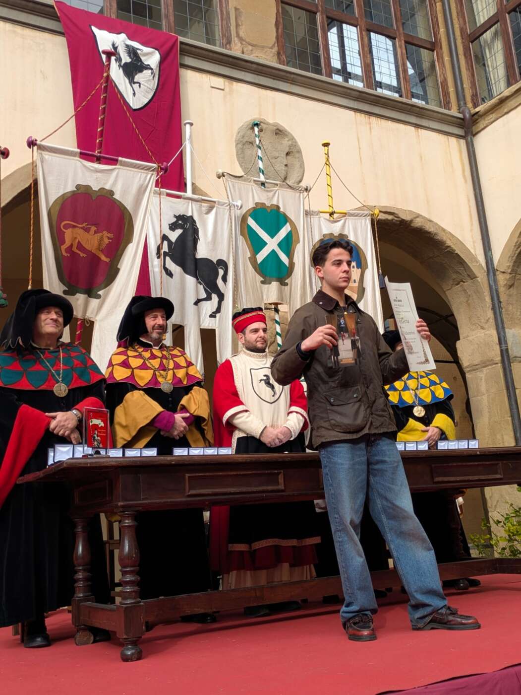 Dopo l’introduzione dell’assessore ha preso avvio la solenne cerimonia con la consegna del Premio “Fulvio Tului”, giunto all’undicesima edizione e consegnato ai quartieri che hanno sfilato meglio nelle edizioni 2025 della Giostra del Saracino: Porta del Foro a giugno, Porta Sant’Andrea a settembre. Presenti alcuni dei giudici del Premio Tului ai quali è stata assegnato un attestato in segno di riconoscimento.
