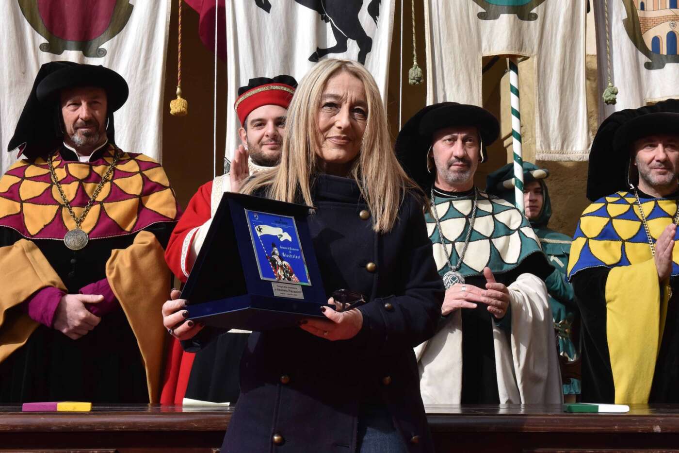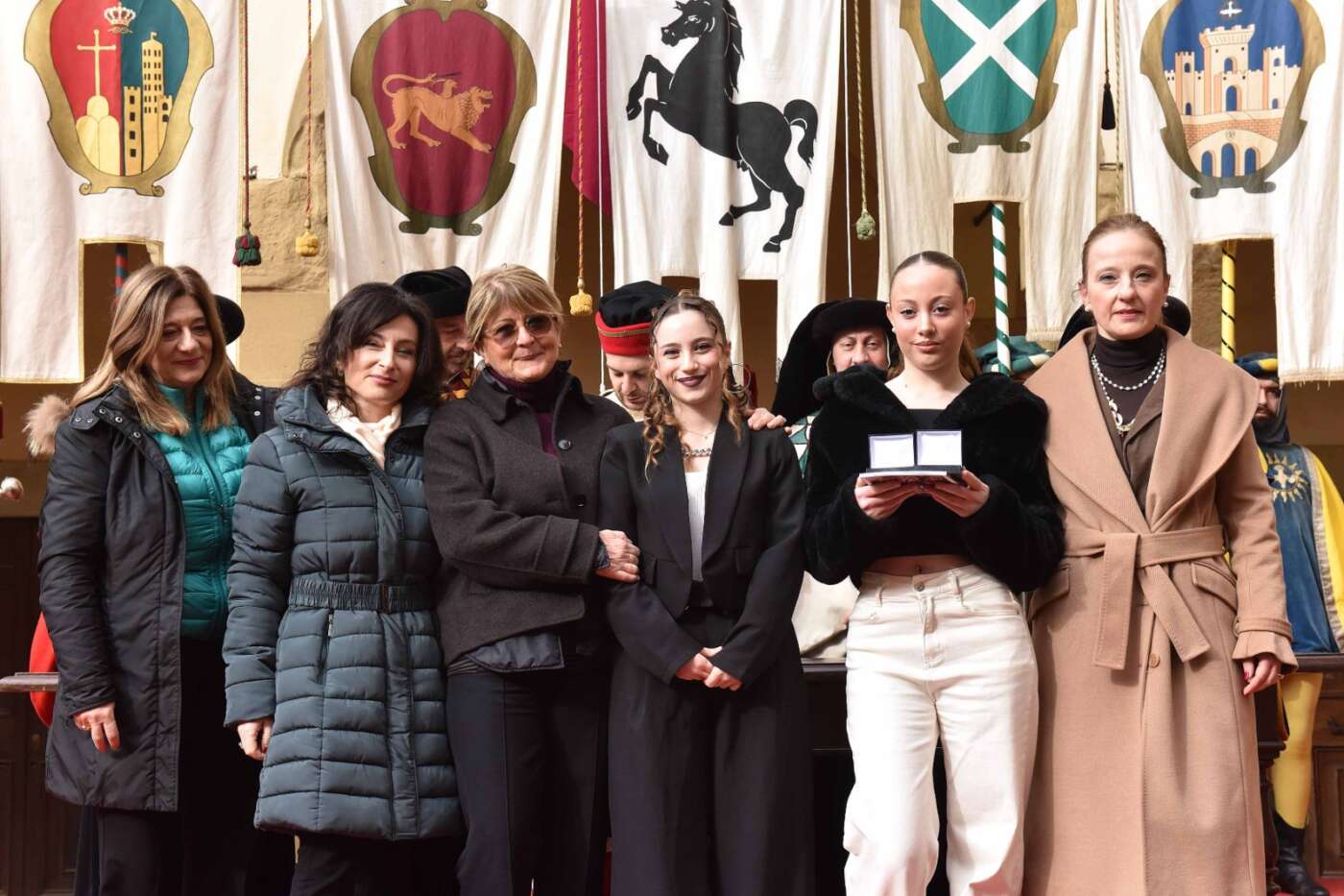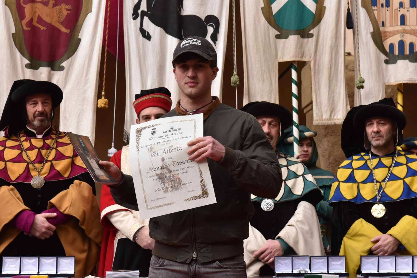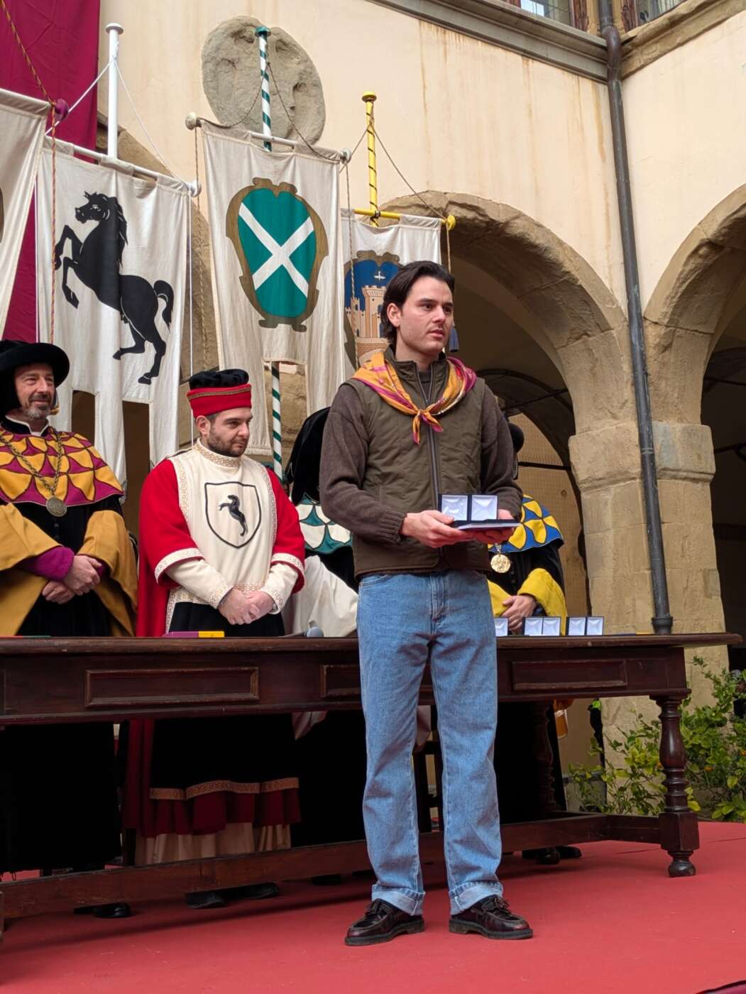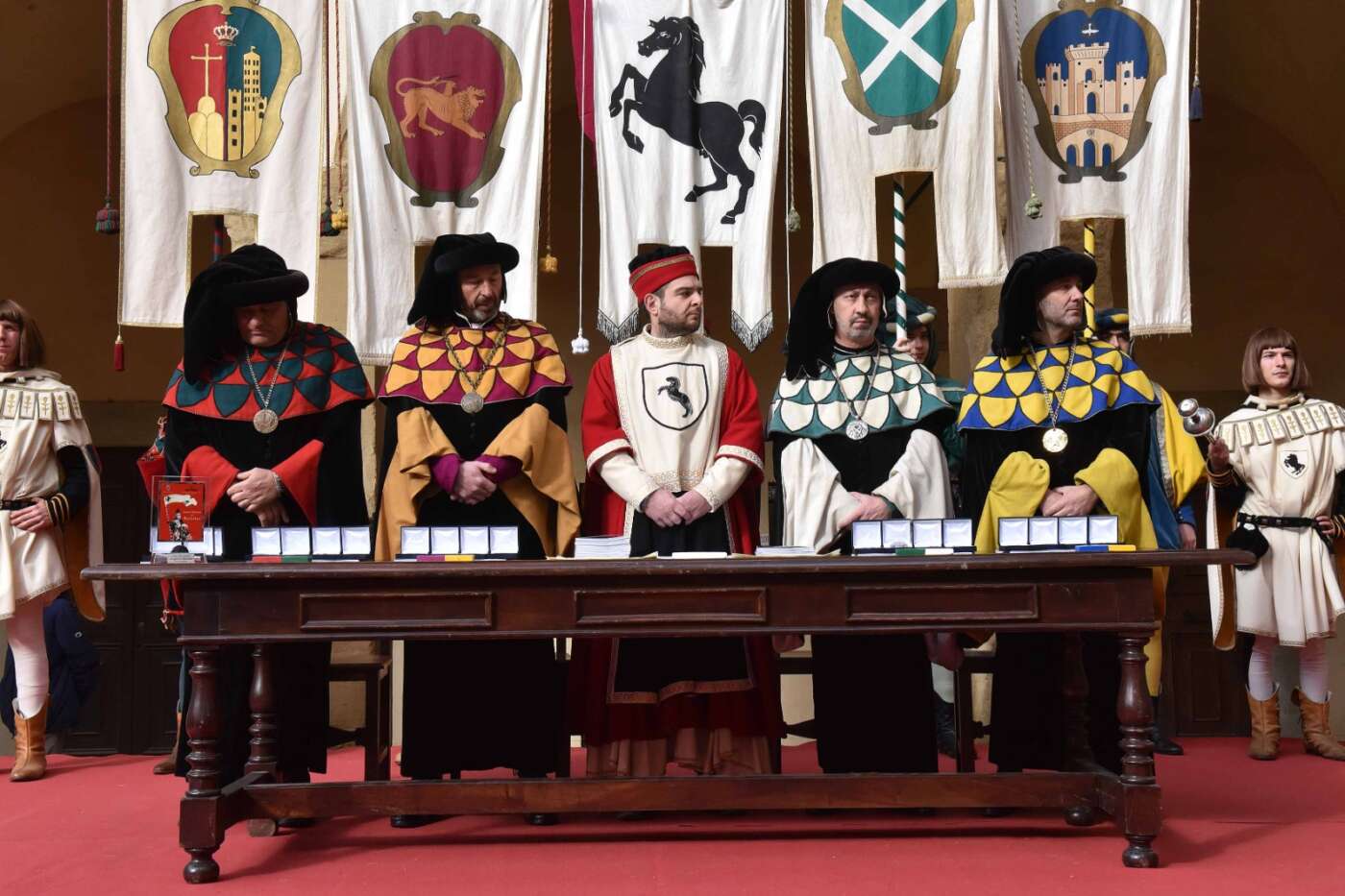 Dopo l’introduzione dell’assessore ha preso avvio la solenne cerimonia con la consegna del Premio “Fulvio Tului”, giunto all’undicesima edizione e consegnato ai quartieri che hanno sfilato meglio nelle edizioni 2025 della Giostra del Saracino: Porta del Foro a giugno, Porta Sant’Andrea a settembre. Presenti alcuni dei giudici del Premio Tului ai quali è stata assegnato un attestato in segno di riconoscimento.