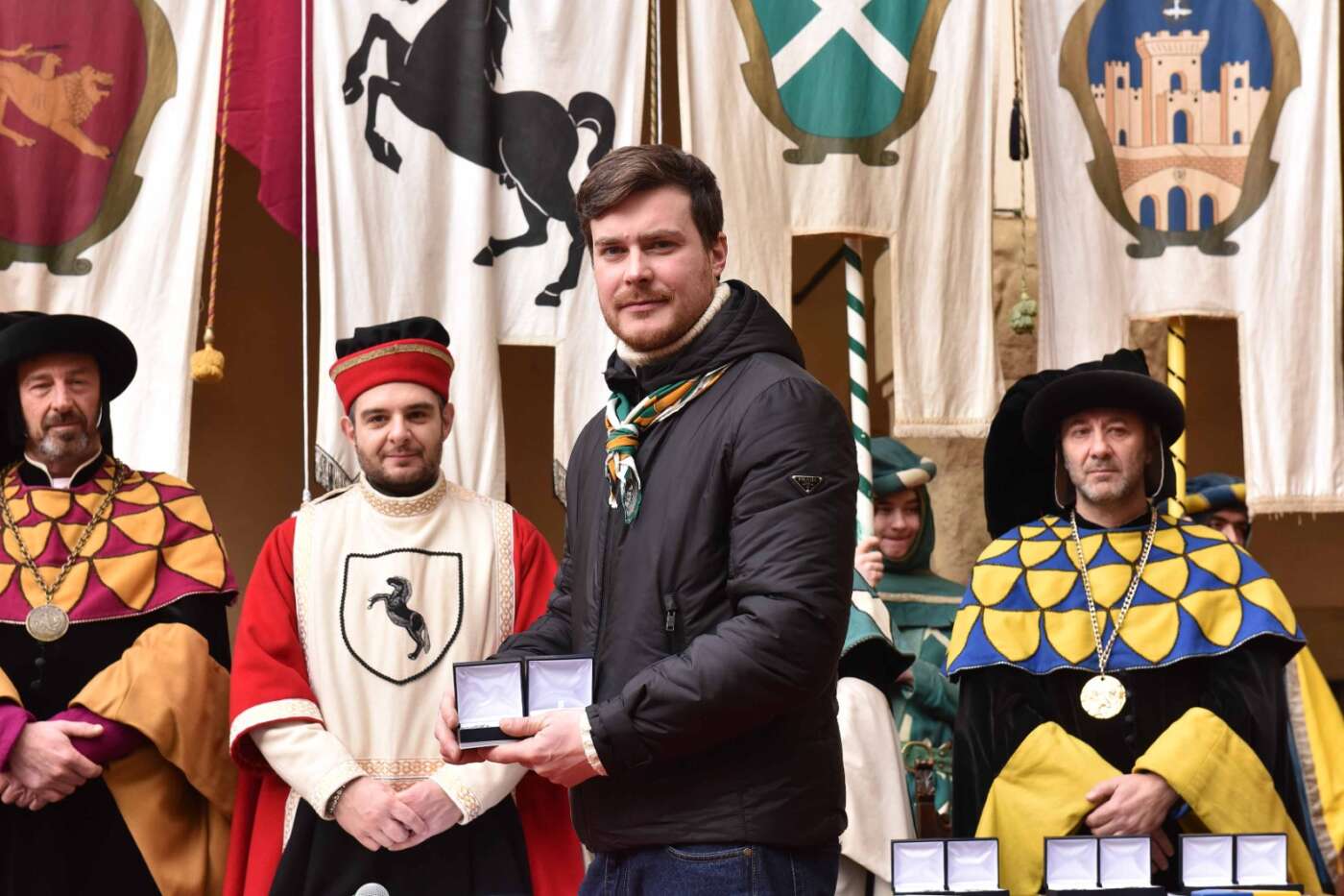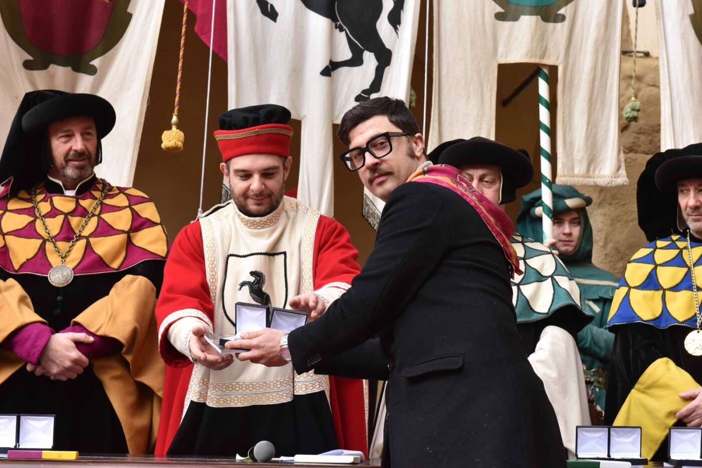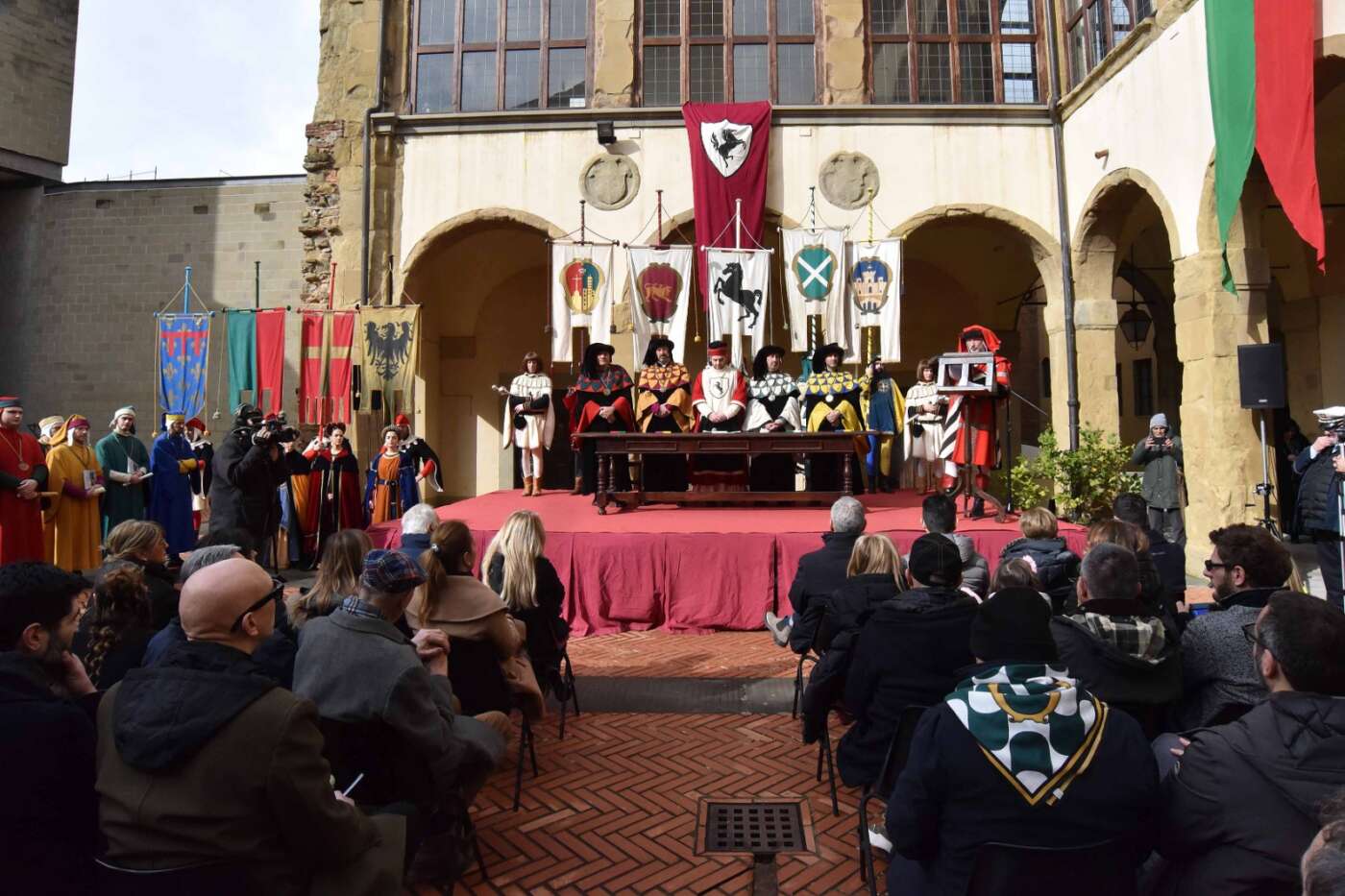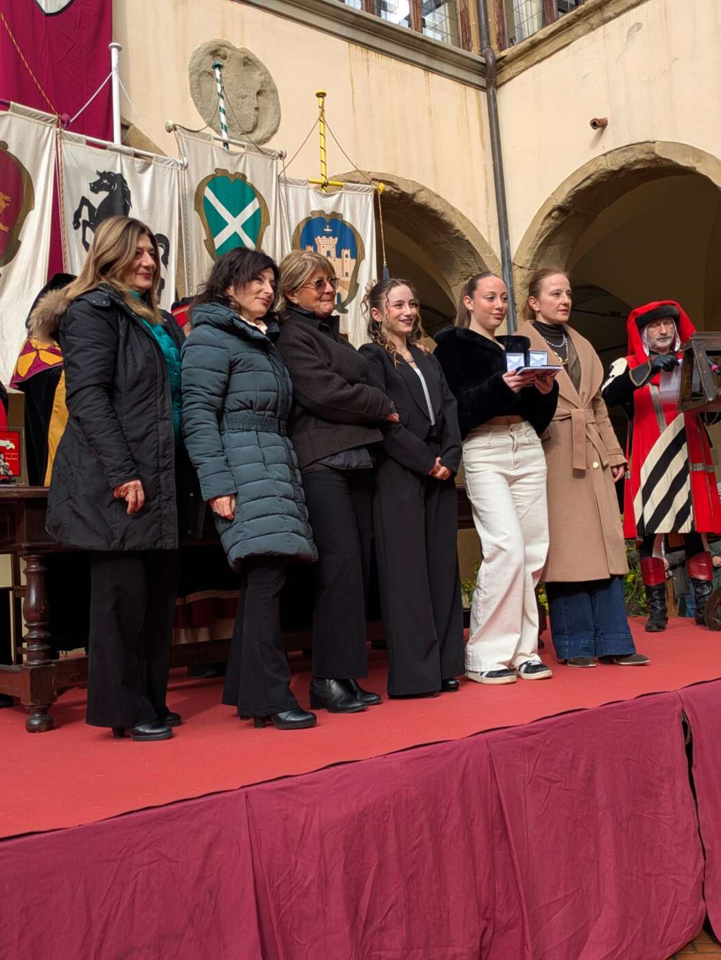 Dopo l’introduzione dell’assessore ha preso avvio la solenne cerimonia con la consegna del Premio “Fulvio Tului”, giunto all’undicesima edizione e consegnato ai quartieri che hanno sfilato meglio nelle edizioni 2025 della Giostra del Saracino: Porta del Foro a giugno, Porta Sant’Andrea a settembre. Presenti alcuni dei giudici del Premio Tului ai quali è stata assegnato un attestato in segno di riconoscimento.