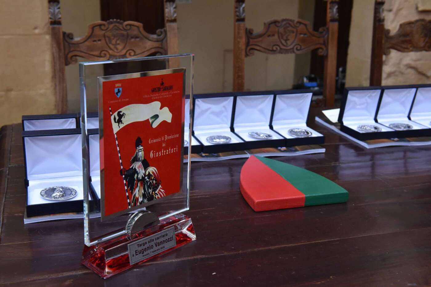 Sono poi stati premiati tutti i giostratori, riserve e titolari. I giostratori che hanno partecipato alle Prove Generali sono stati premiati con le pergamene, mentre i titolari hanno ricevuto le medaglie d’argento create sulle cere realizzate dagli studenti dell’Istituto Tecnico e Professionale di Arezzo – Sezione Orafi che riprendono il tema della dedica di ogni edizione della Giostra. Assegnato dunque un riconoscimento al dirigente scolastico Renzo Izzo, alle docenti Silvia Bennati, Aurora Peruzzi e Martina Scala e alle studentesse Marta Falsetti e Rita Bozza.