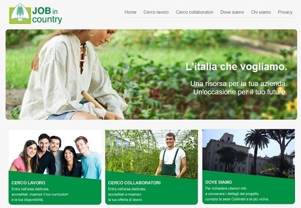 La confederazione nazionale Coldiretti ha elaborato una struttura d’intermediazione tra domanda ed offerta di lavoro che dà a imprese e lavoratori uno strumento e un luogo di incontro. “Job in Country“, autorizzata al servizio d’intermediazione della manodopera dal Ministero del Lavoro, si pone l’obiettivo di far incontrare nei singoli territori i bisogni delle aziende in cerca di manodopera con quelli dei cittadini che aspirino a nuove opportunità di inserimento lavorativo, in un quadro di assoluta trasparenza e legalità.
