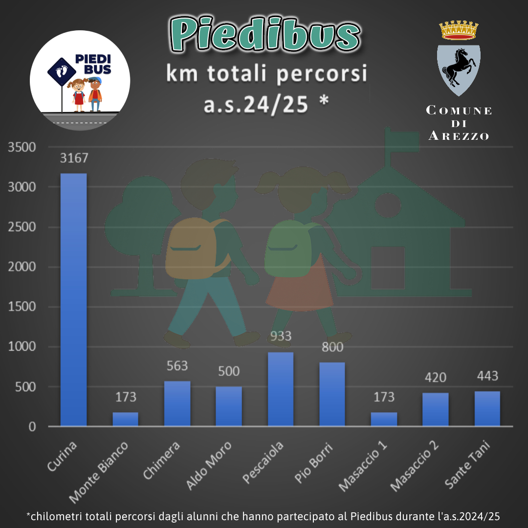 Arezzo – Oltre 7.000 km percorsi a piedi e 1.000 kg di CO₂ risparmiati nell’anno scolastico 2024/2025. “Il Piedibus è una delle iniziative che meglio rappresentano la nostra idea di città sostenibile. È un progetto che unisce salute, educazione e tutela dell’ambiente, ma soprattutto coinvolge bambini e famiglie in un percorso quotidiano di responsabilità e partecipazione. I risultati raggiunti fino ad oggi dimostrano che, con semplici azioni e con la collaborazione di tutti, possiamo migliorare concretamente la qualità della vita e della mobilità ad Arezzo. Il mio ringraziamento va ai volontari e alle scuole: sono loro il motore di questo successo”. L’assessore Alessandro Casi commenta così l’iniziativa Piedibus che anche per l’anno scolastico in corso è stata rinnovata per promuove la mobilità sostenibile e uno stile di vita attivo tra i bambini delle scuole primarie.