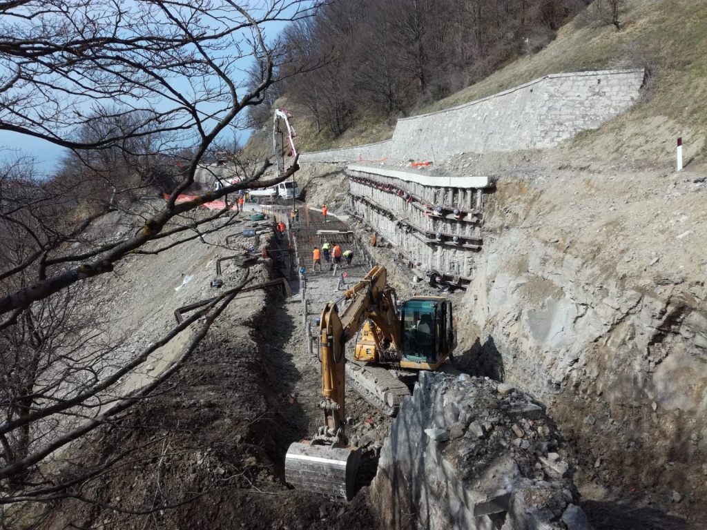 La prima fase ha riguardato la realizzazione oltre 80 micropali in profondità e 45 tiranti per il consolidamento del versante in frana. A seguire è stato eseguito lo sbancamento per la rimozione dell’intera quantità di terra interessata dal dissesto, per circa 100 metri di estensione. Attualmente è in corso di completamento la realizzazione delle nuove opere di sostegno: una fondazione profonda con altri 150 micropali e un muro di contenimento alto oltre 6 metri.