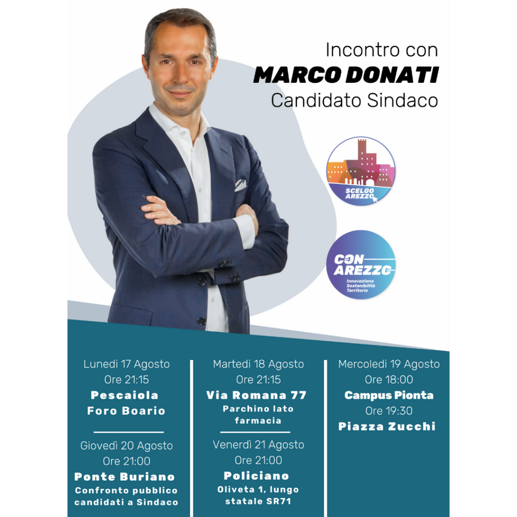 Il candidato sindaco Marco Donati e alcuni candidati delle liste civiche Scelgo Arezzo e Con Arezzo saranno inoltre presenti con il gazebo, martedì 18 agosto, dalle ore 9 alle ore 12:30, al mercato settimanale di Rigutino, e sabato 22 agosto, dalle 8:30 alle 13, al mercato di viale Giotto ad Arezzo (postazione all’intersezione con via Tiziano).