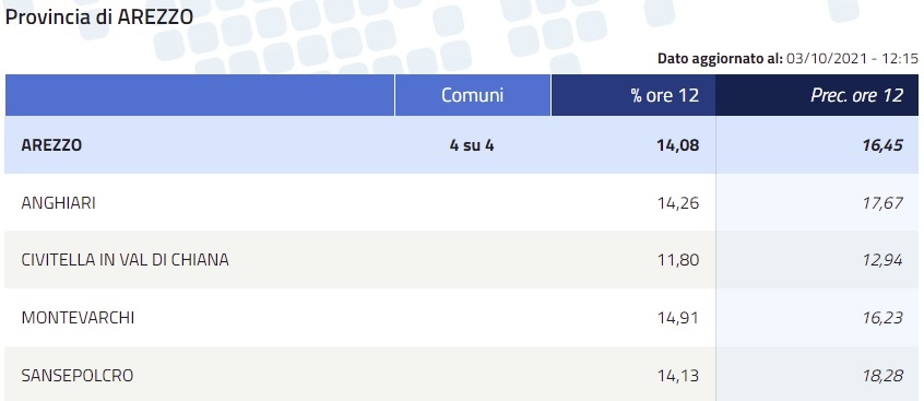 Suppletive Camera – TOSCANA 12 – Dettaglio provincia di Arezzo – La rilevazione dell’affluenza delle ore 12 di domenica 3 ottobre