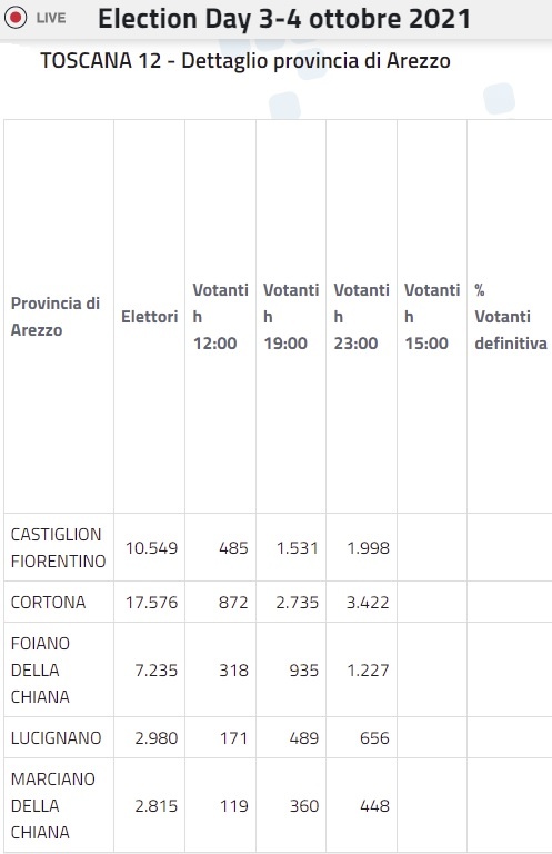 Suppletive Camera – TOSCANA 12 – Dettaglio provincia di Arezzo – La rilevazione dell’affluenza delle ore 23 di domenica 3 ottobre