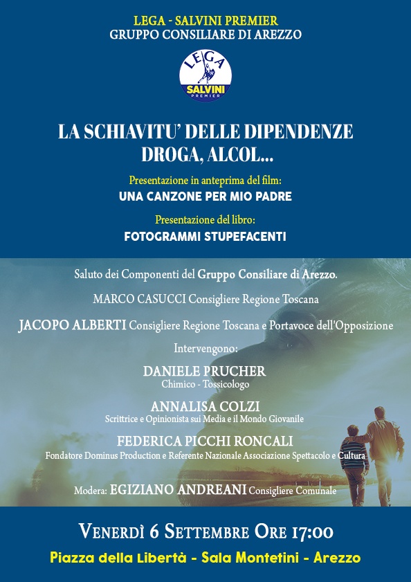 Tra i relatori Daniele Prucher, chimico e tossicologo, dirigente della Asl di Arezzo; Annalisa Colzi, scrittrice e opinionista; Federica Picchi Roncali, fondatrice della casa editrice Dominus Production. Durante il convegno sarà presentato il libro “Fotogrammi stupefacenti – Storia di una rivincita” di Federico Samaden e verrà proiettato il trailer del film “Una canzone per mio padre”, la storia vera di Bart Millard.