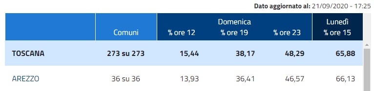 Ore 19 – Per il referendum in provincia di Arezzo ha votato il 36,41%, per le regionali il 35,6%, per le comunali di Arezzo il 36,73%. Le percentuali di voto dei Comuni della provincia per le regionali: la più alta Capolona, la più bassa Sestino