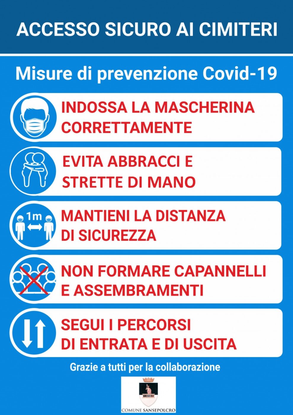 È stata predisposta un’apposita informativa che verrà affissa in tutti i cimiteri e che ricorda le regole per accedere: indossare correttamente la mascherina, evitare abbracci e strette di mani, mantenere la distanza di sicurezza, non formare capannelli e assembramenti e seguire i percorsi di entrata e uscita.