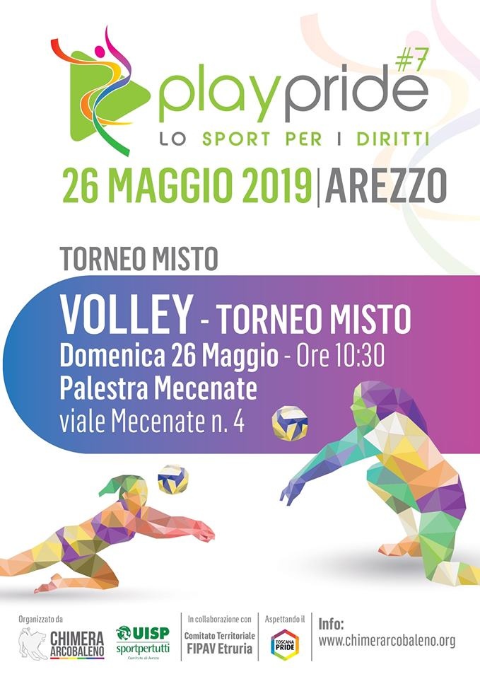 E’ tutto pronto per la 7° edizione di “PLAY PRIDE – lo sport per i diritti”, l’evento promosso da Chimera Arcobaleno Arcigay Arezzo e UISP Comitato Territoriale Arezzo per abbattere pregiudizi e discriminazioni basati su identità e orientamenti sessuali attraverso lo sport. Domenica 26 maggio nella palestra Mecenate di Arezzo saranno 12 le squadre che scenderanno in campo dalle 10.30 per il torneo di pallavolo misto, in cui genere, identità di genere, orientamento affettivo o età non sono un discrimine.