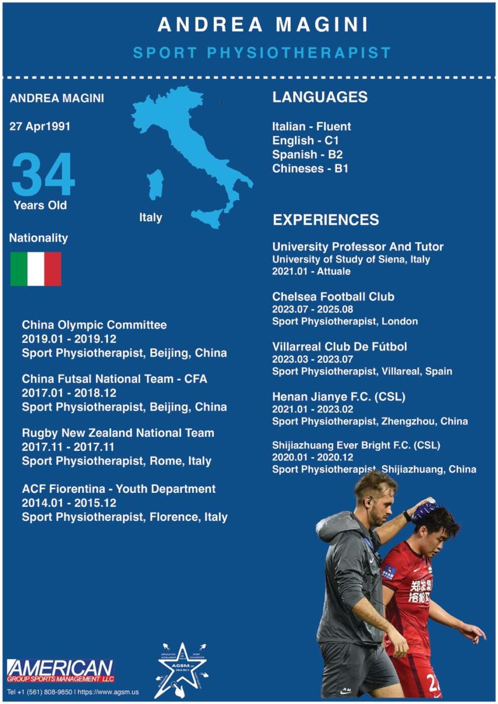 Attualmente Head of Rehabilitation & Injury Prevention, Magini ha costruito il proprio percorso in club, federazioni e contesti olimpici tra Europa, Asia e Regno Unito, affermandosi come una figura di riferimento nello sport d’élite. Un cammino che ha raggiunto uno dei suoi momenti più significativi con il recente trionfo in UEFA Conference League con il Chelsea Football Club, culminato nella conquista di un trofeo europeo.